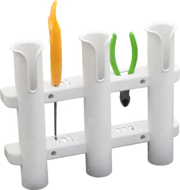 Держатель для спиннинга позволяет закреплять одновременно в количестве трех единиц одновременно. Между держателями есть места для хранения ножей и плоскогубцев. Изготовлен из стойкого к ультрафиолету полипропилена. В комплект входит крепление.