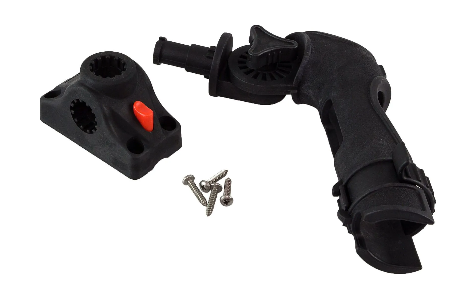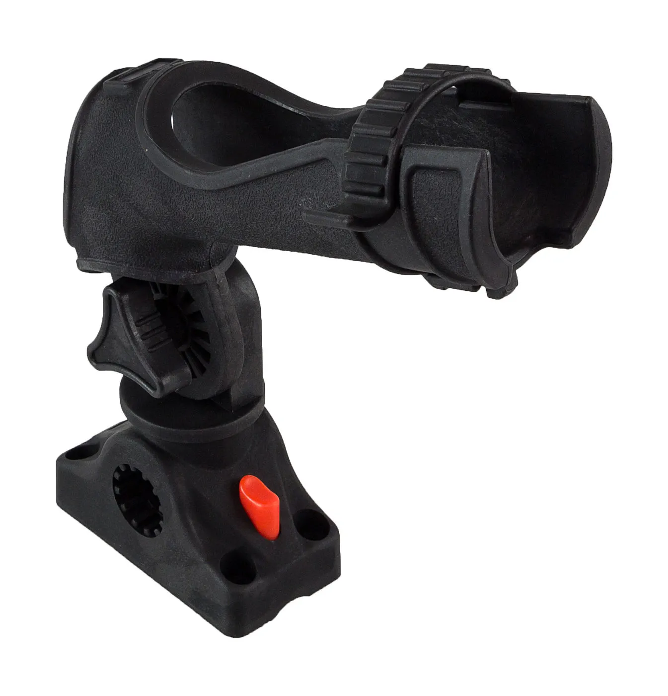 Подставка под удочку с регулируемым держателем, который позволяет выбрать угол наклона, направление удочки (по ходу/против хода движения лодки), а так же способ расположения - вертикально или горизонтально.
