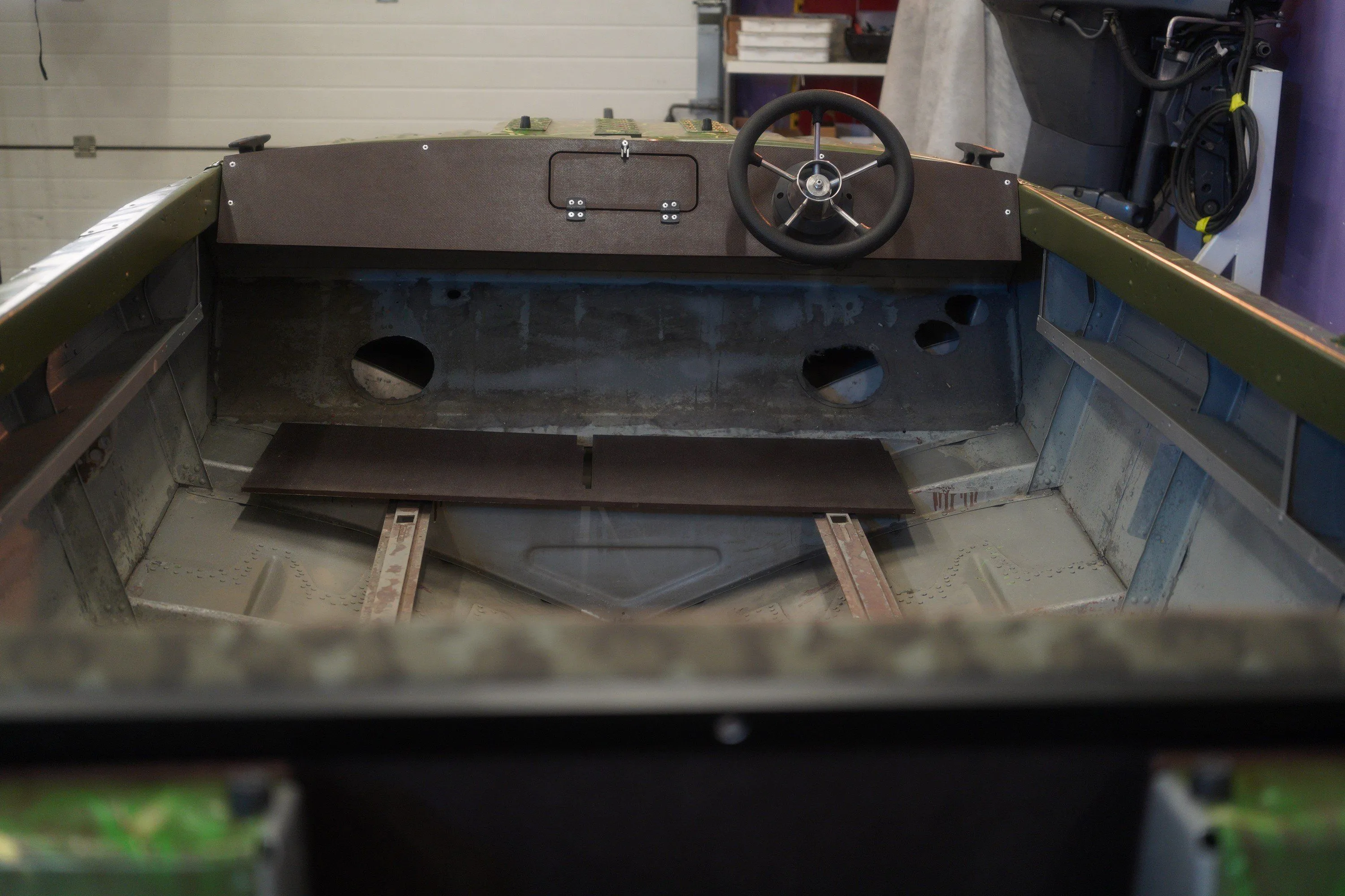 Накладка торпедо позволяет закрыть ненужные отверстия на заводском элементе советской алюминиевой лодки. На ней удобно разместить приборы контроля движения и панели переключателей, в тех местах где это требуется именно вам.