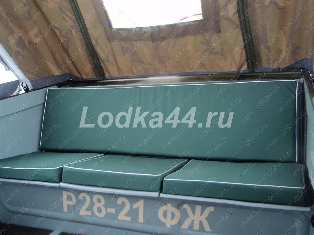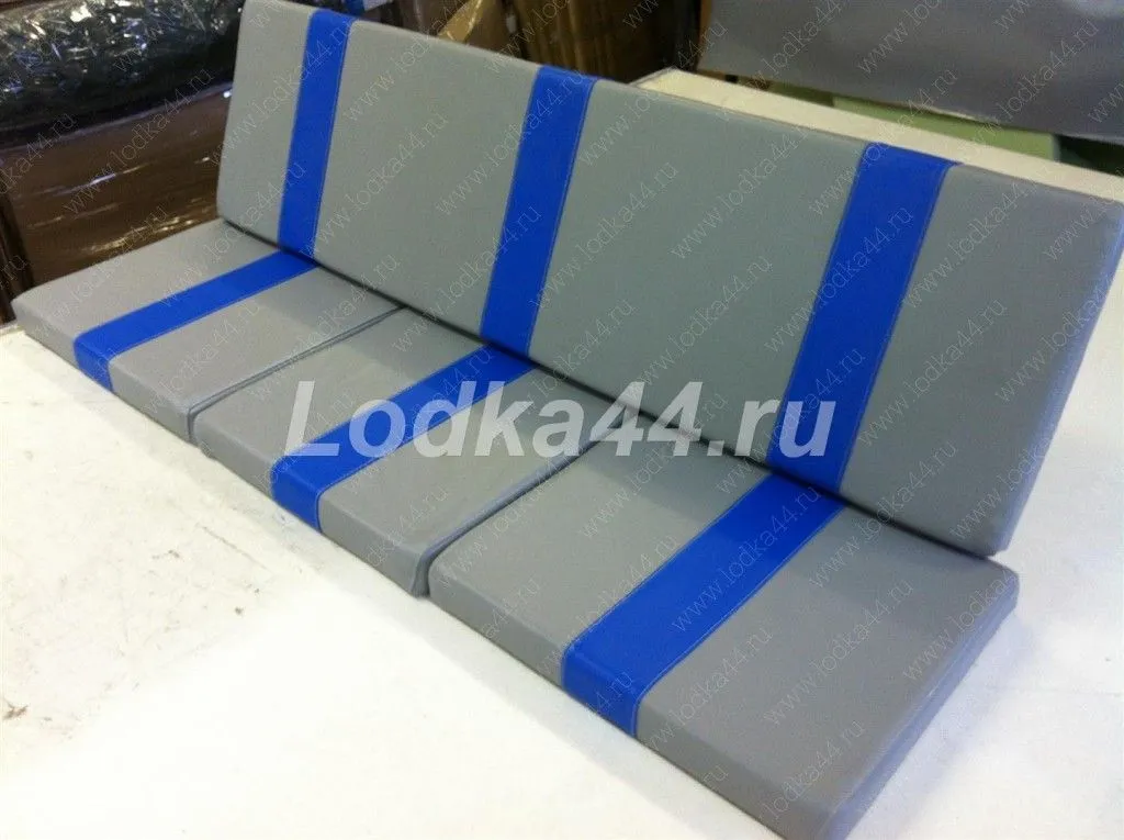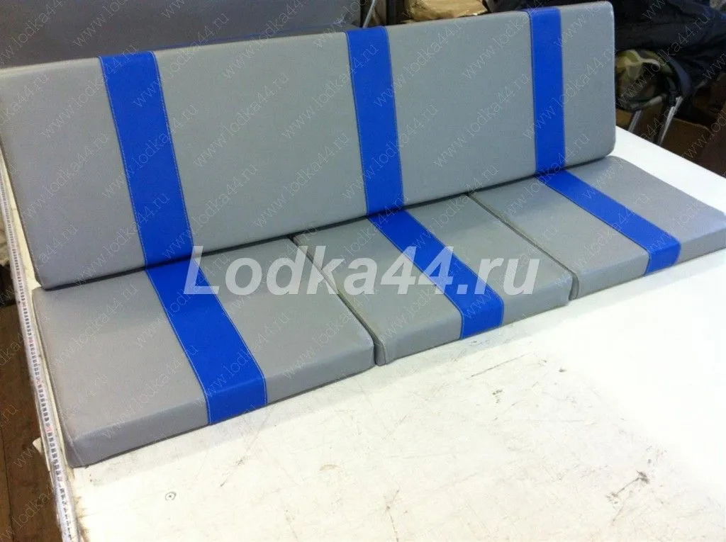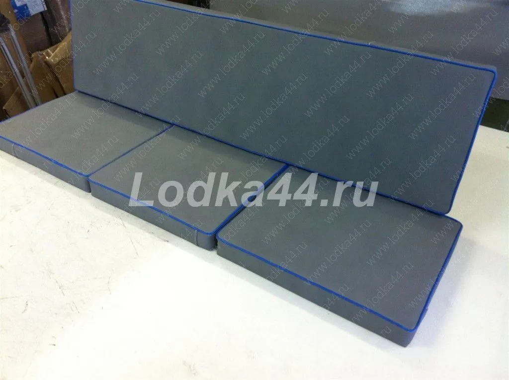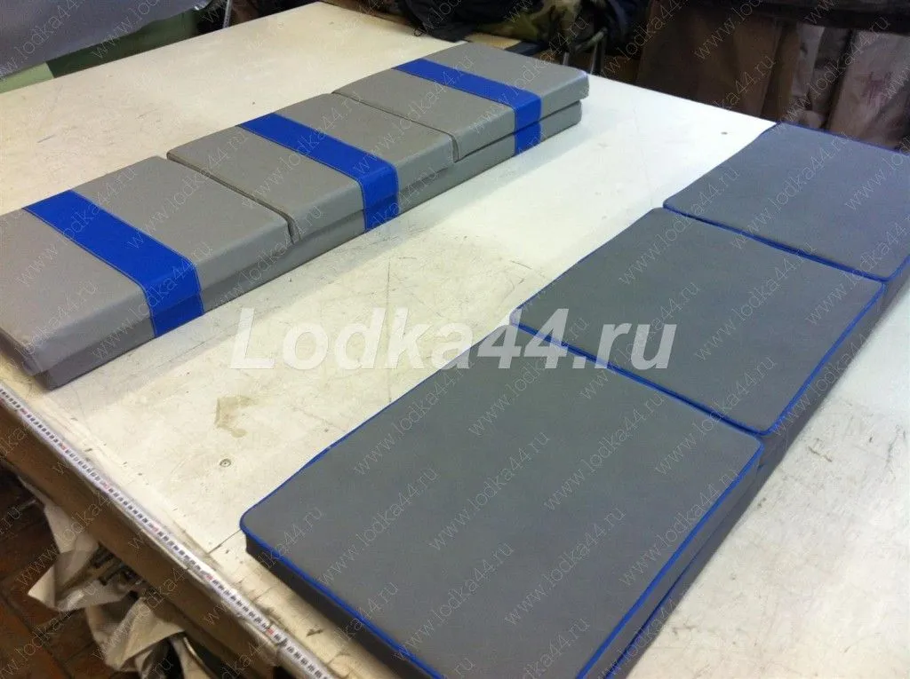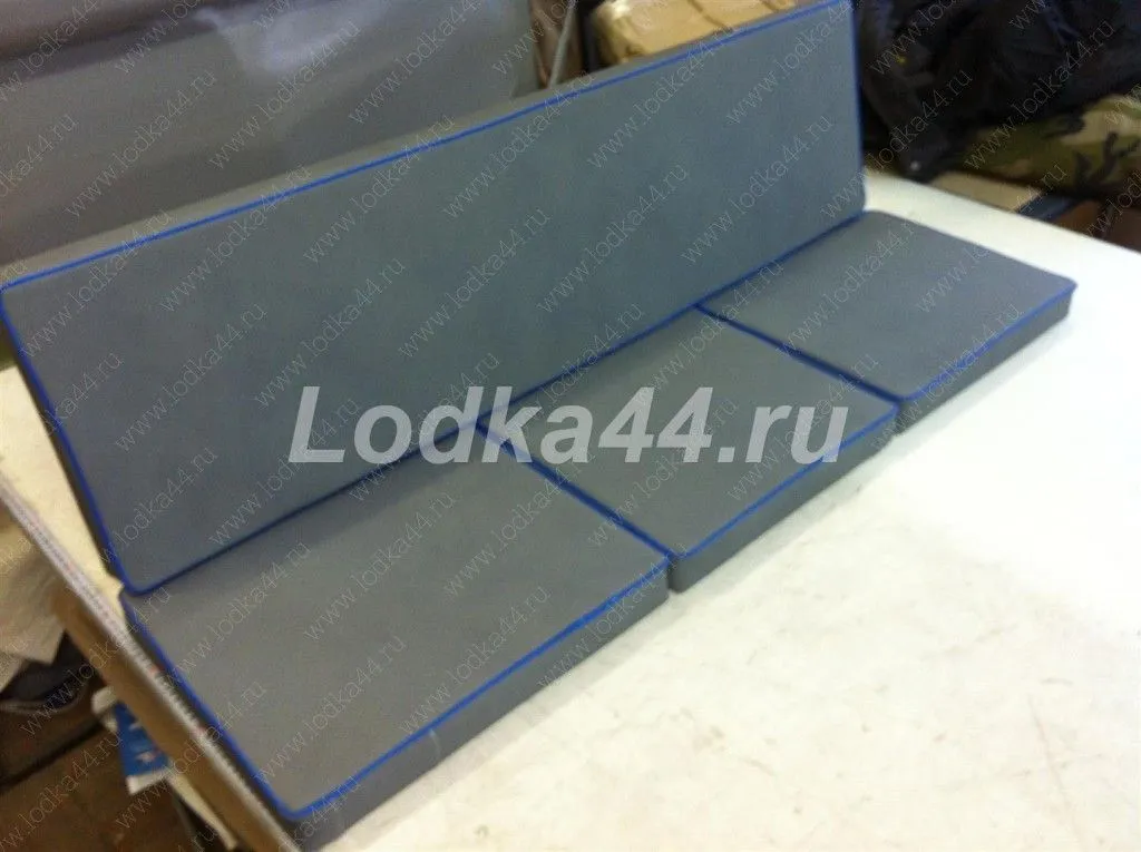 Мягкие накладки задних сидений для лодок "Казанка-5м, 5м2, 5м3, 5м4". Основание из влагостойкой фанеры, поролон повышенной плотности, водонепроницаемый материал. Накладки крепятся к существующему каркасу с помощью саморезов. Элемент основания на 5 см консольно свисает относительно каркаса рундука.