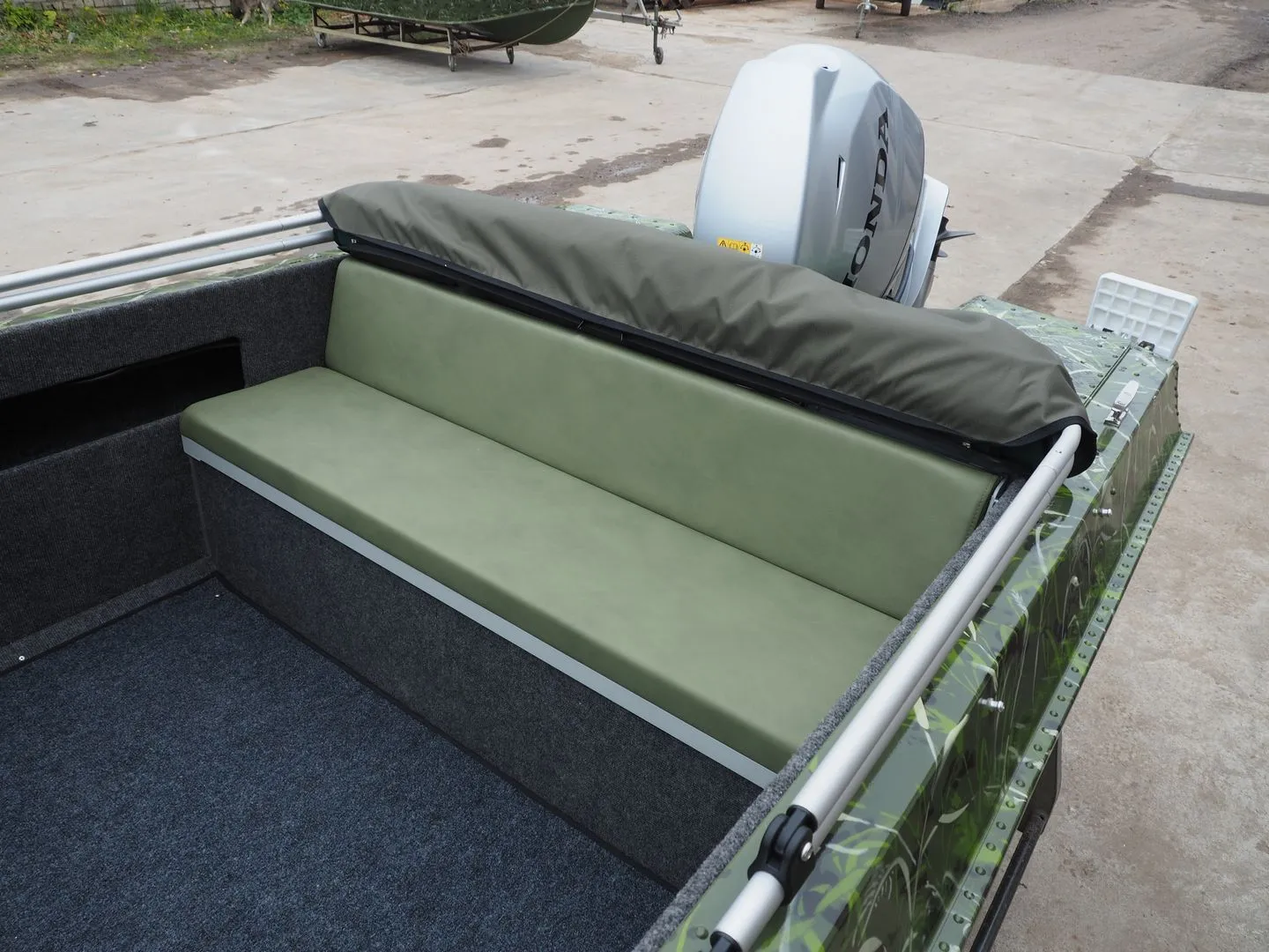 Диван откидывается на осях вращения, устанавливаемых в бортовой элемент лодки.