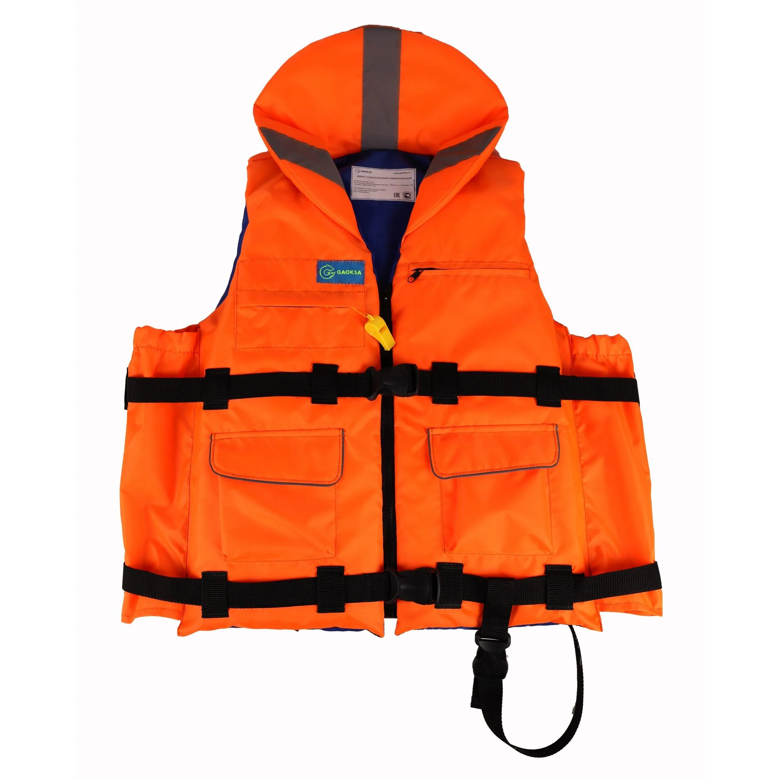 Спасательный универсальный жилет. Расчитан на вес 30-50 кг с подголовником и светоотражающими элементами.
