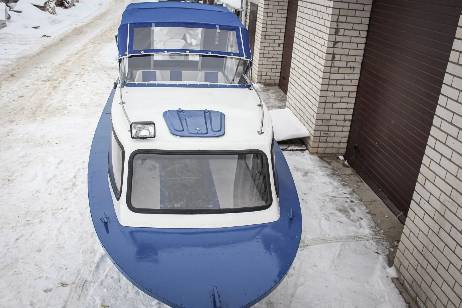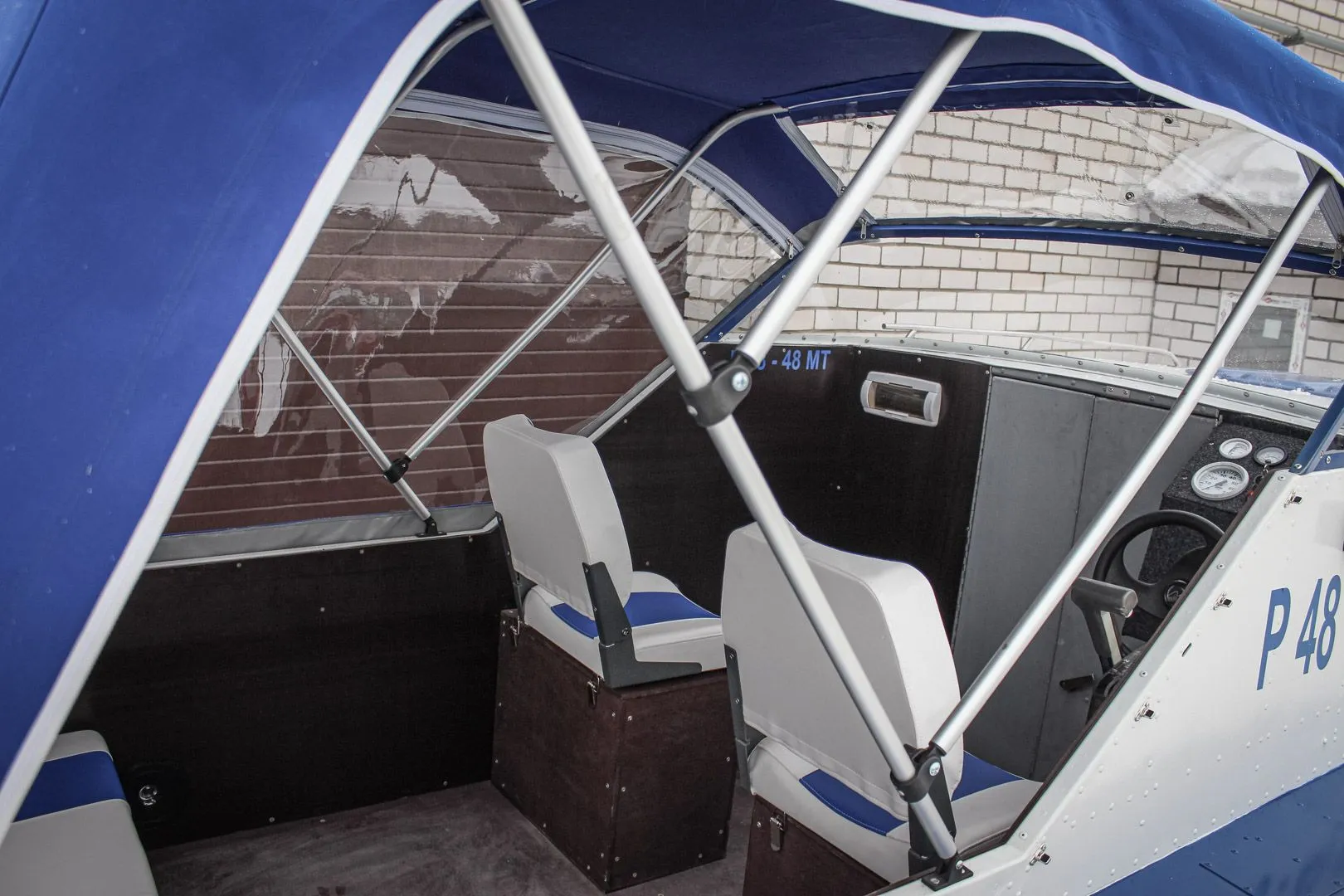 Корпус лодки был окрашен с дополнительным нанесением полос, выгодно подчеркивающих внешний облик катера «Амур-2». Для защиты от ветра и дождя водителя и пассажиров мотолоодка оборудована высоким ходовым тентом, позволяющим многим стоять в полный рост. С целью уменьшения надводных габаритов, удобства для транспортировки и хранения тройные дуги наделены функцией откидывания к корме. А для защиты непосредственно самого катера при перевозке был изготовлен транспортировочный тент.