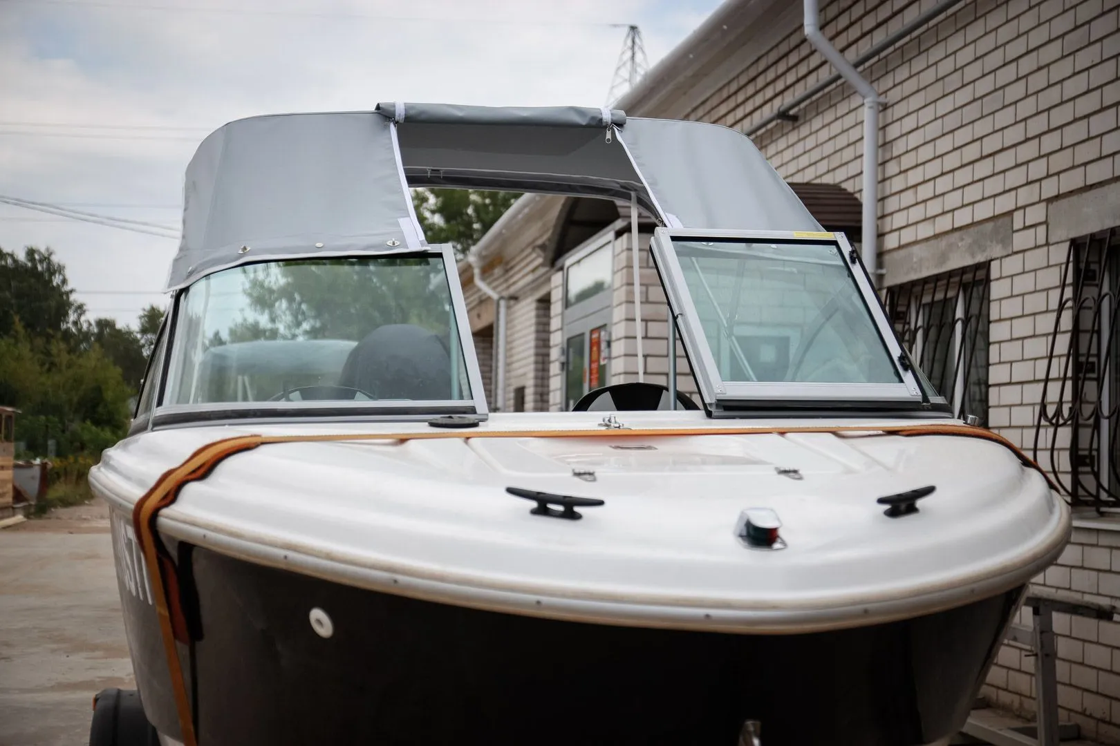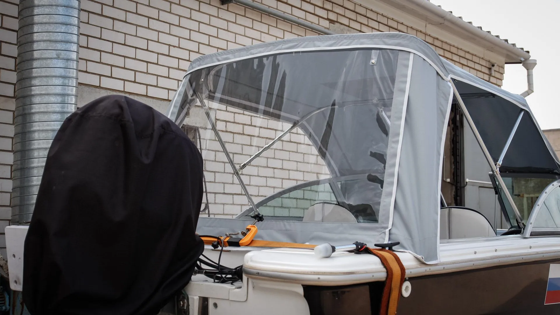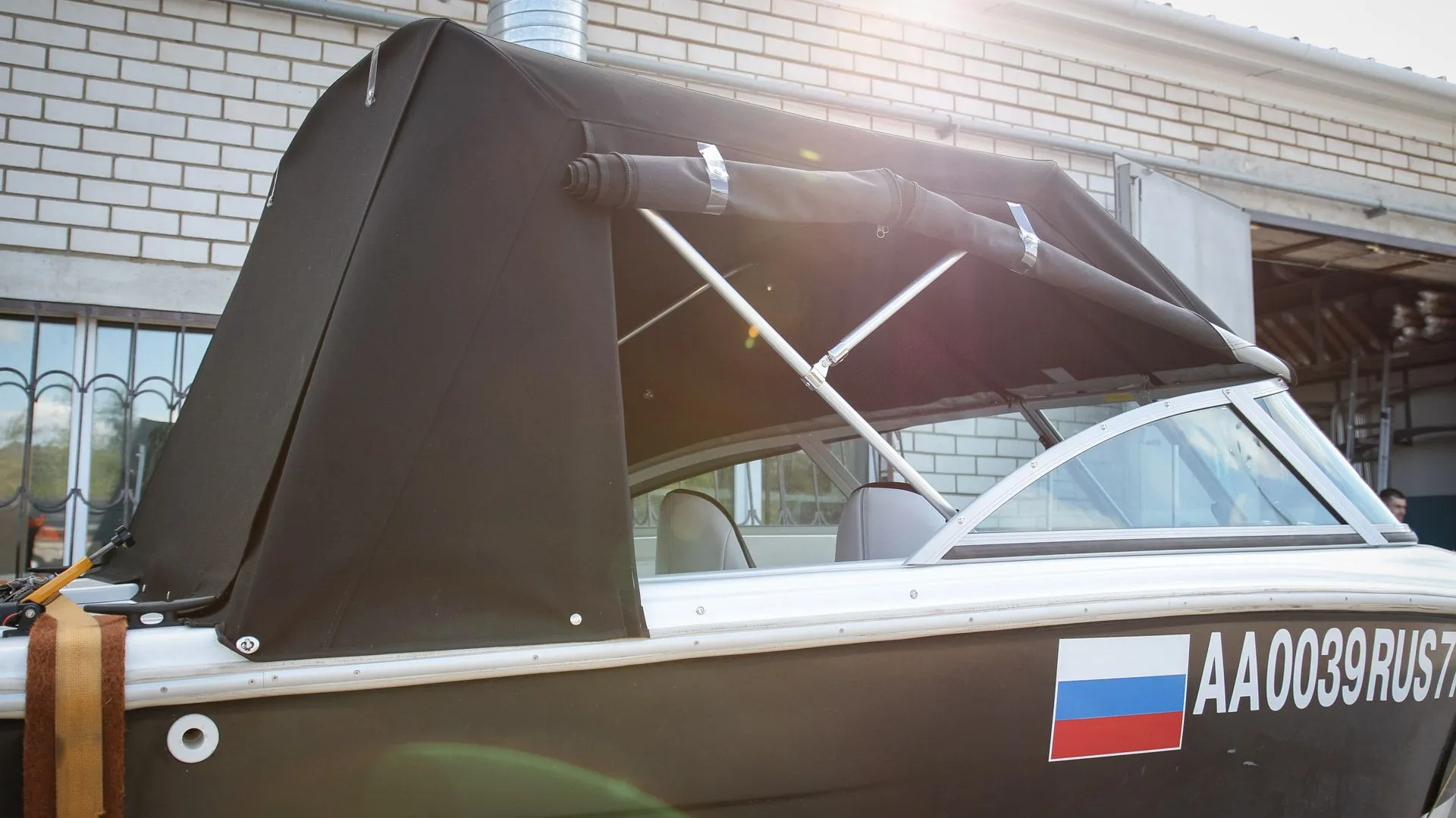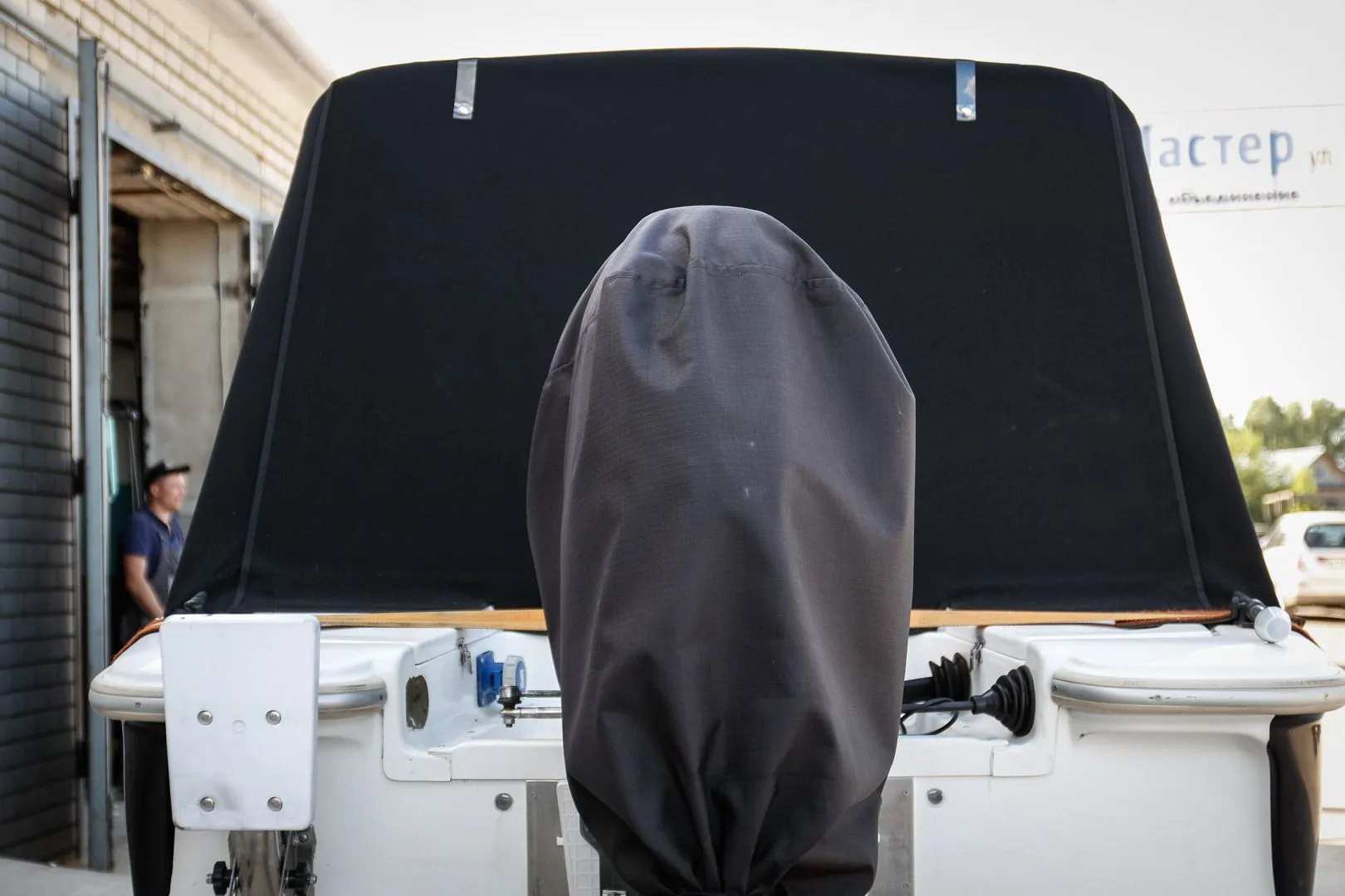 Тент ходовой в базовой комплектации оснащён двумя молниями для выхода к мотору, двумя молниями для поднятия боковин при натянутой крыше и комплектом крепежа в виде кнехт.