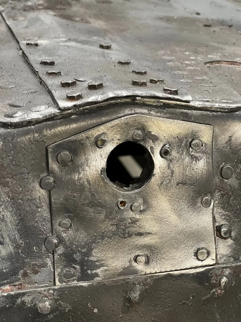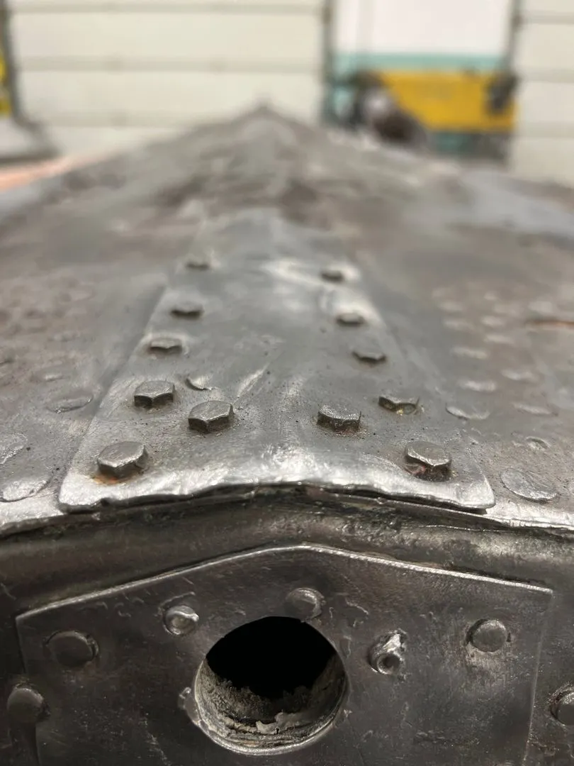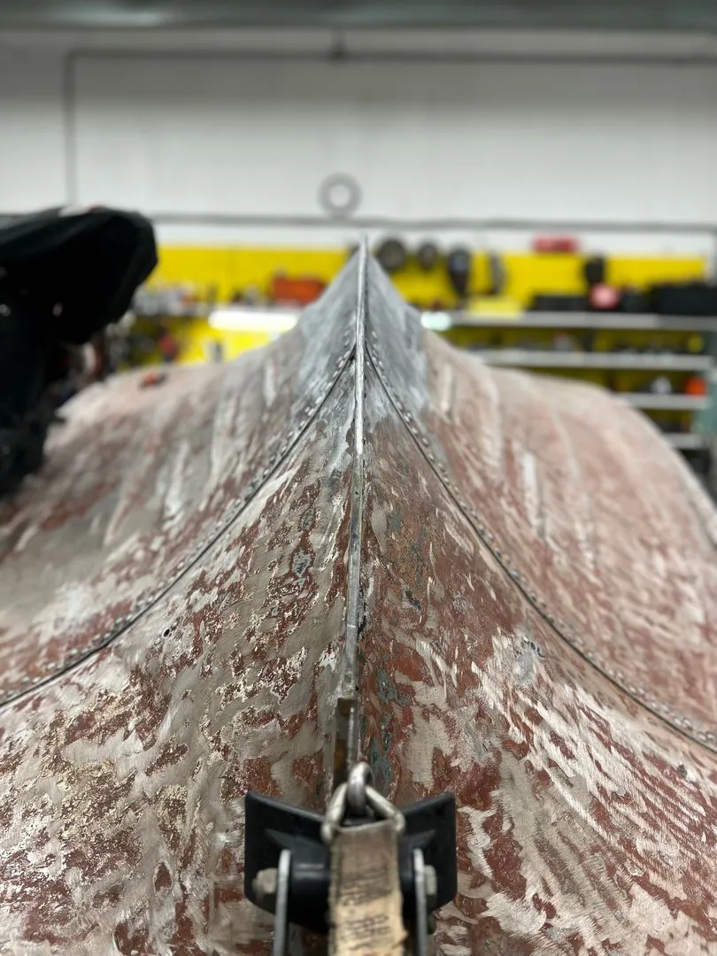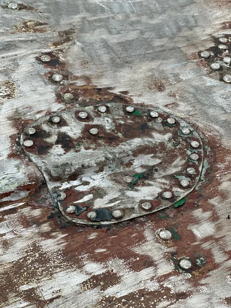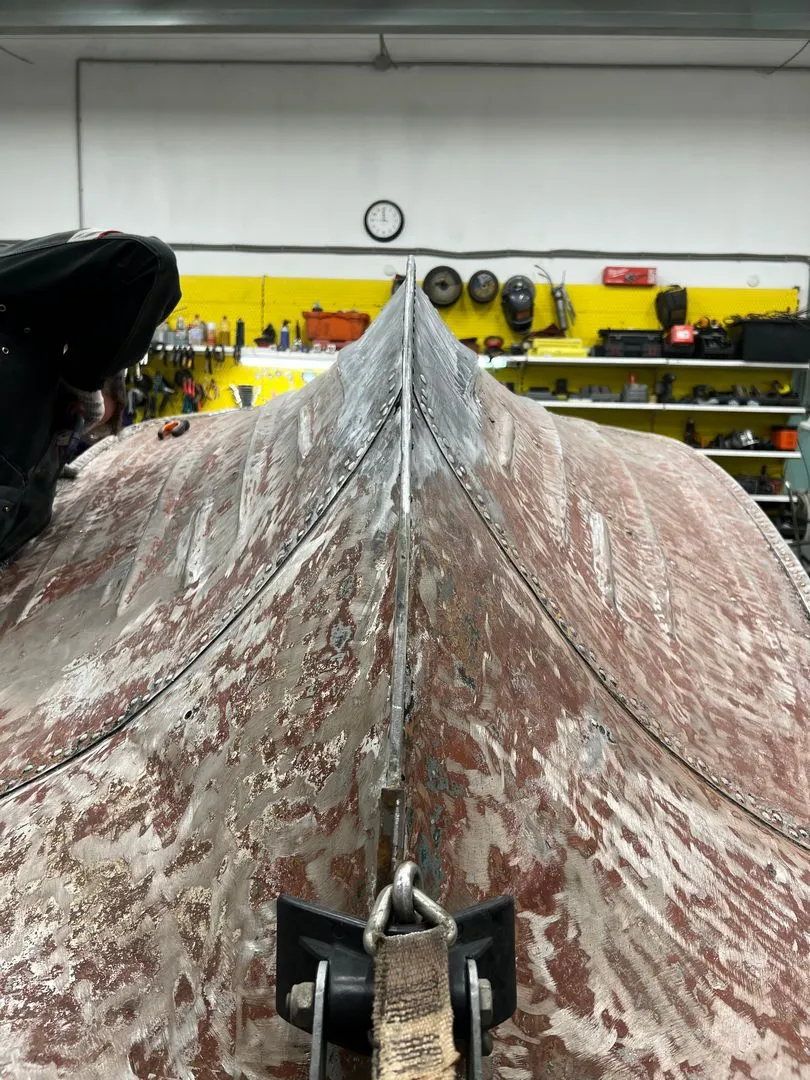 Закончив работу с транцем, мы перешли к ремонтным вмешательствам на днище лодки. В процессе заменив несколько заплаток на новые, удалив болты, повреждённые заклёпки и заменив накладки обводов которые особенно сильно пострадали от коррозии.