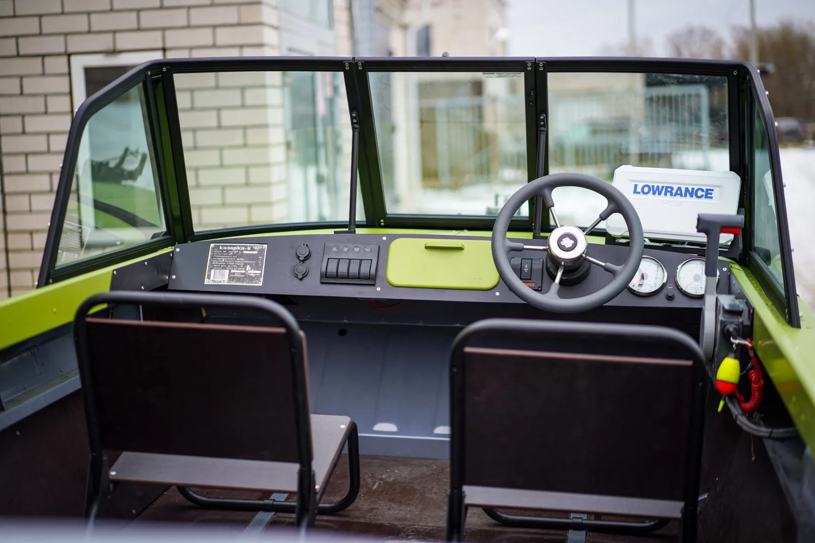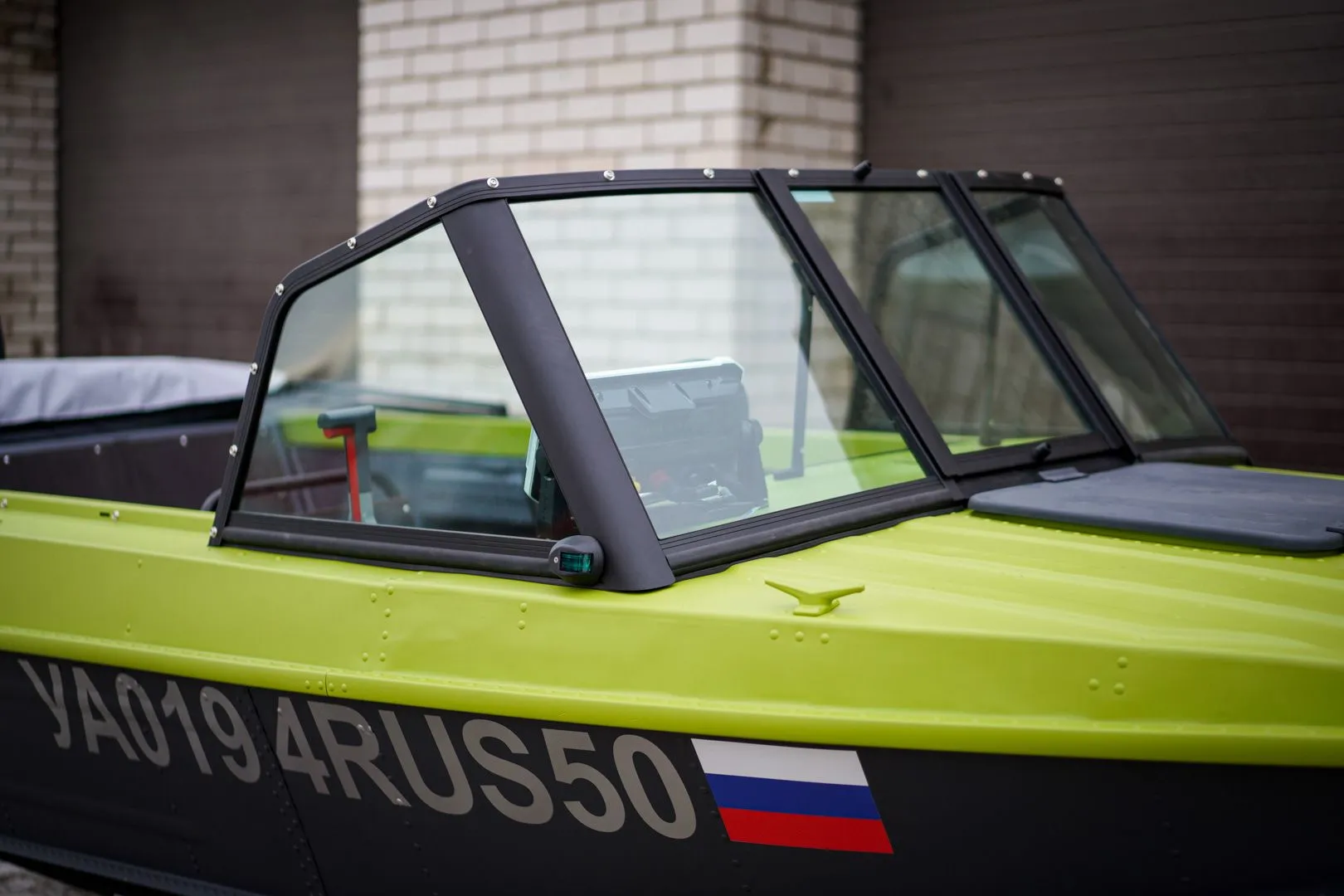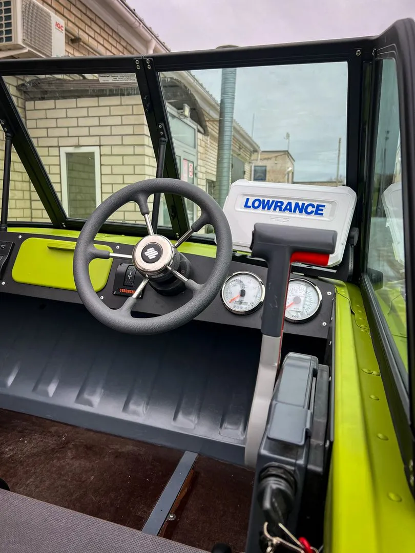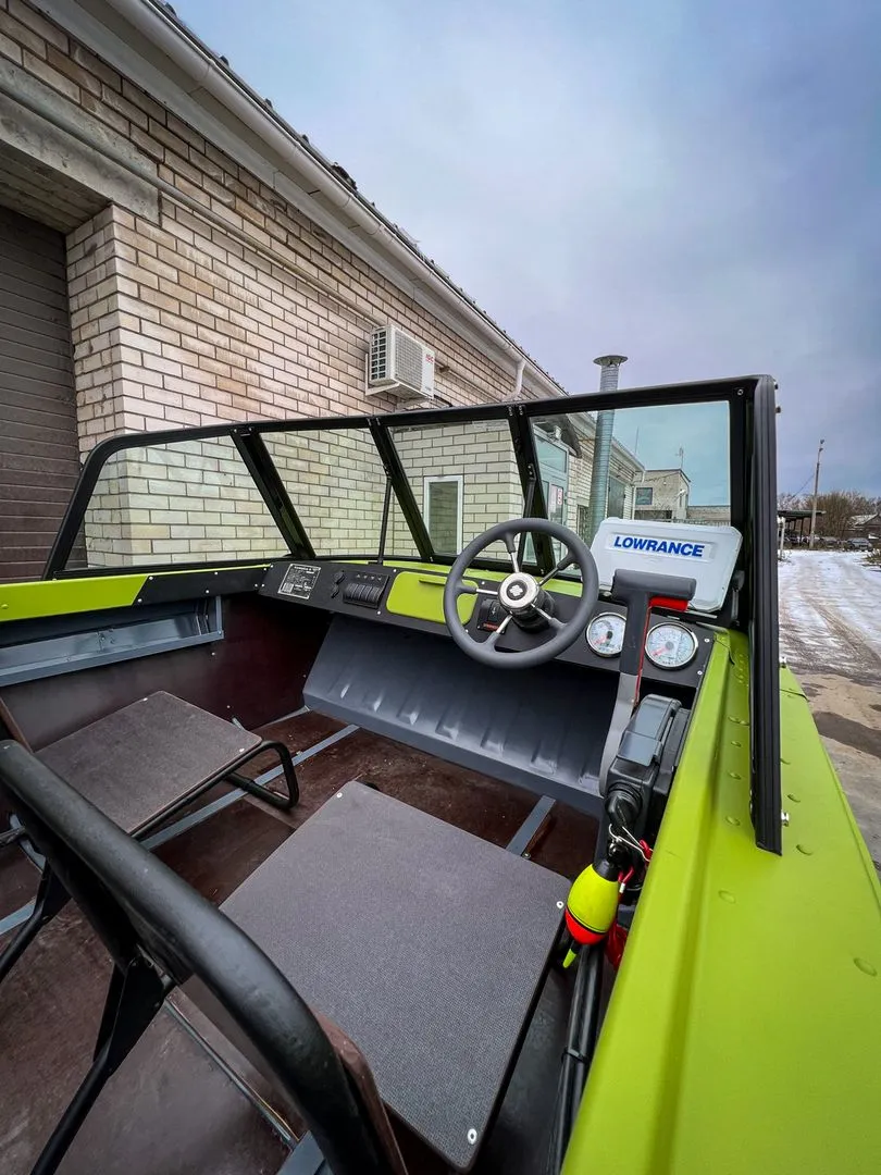 При выборе ветрового стекла, владелец лодки решил не щелочиться и выбрал самую передовую из серийных, модель ветрового стекла именуемую на нашем сайте AUTO. Данная модель обладает мощной рамкой из алюминиевого профиля, окрашенного в чёрный и закалённое стекло.