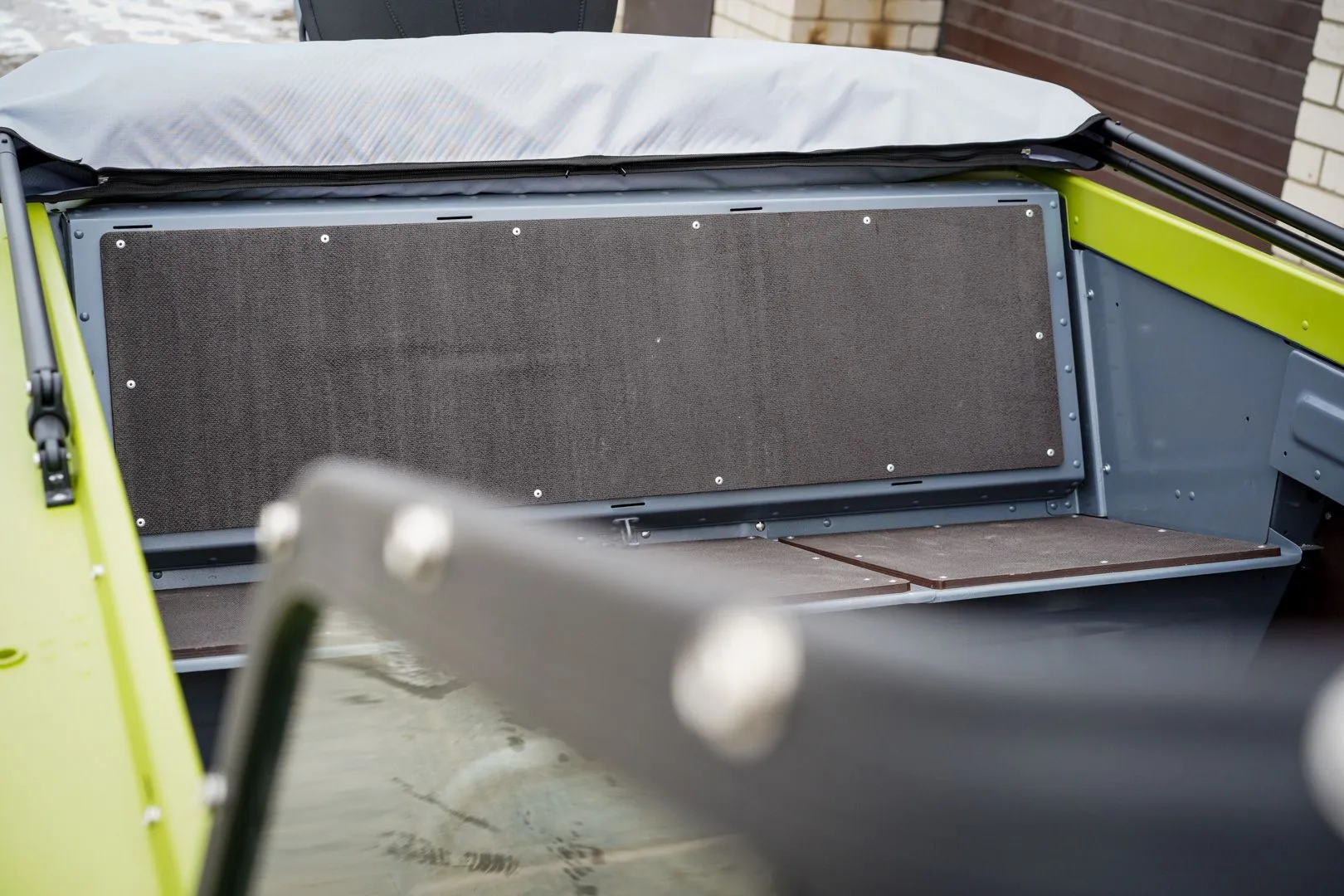 Первой из корпусных доработок стала установка комплекта усиления транца. В данный комплект входит как новая транцевая доска изготовленная из алюминиевых боксов, так и верхняя накладка с самоотливным рецессом. В дополнение к комплекту усиления, на транец были смонтированы новые алюминиевые кринолины, установленные вровень с верхней накладкой и образующие единую плоскость.