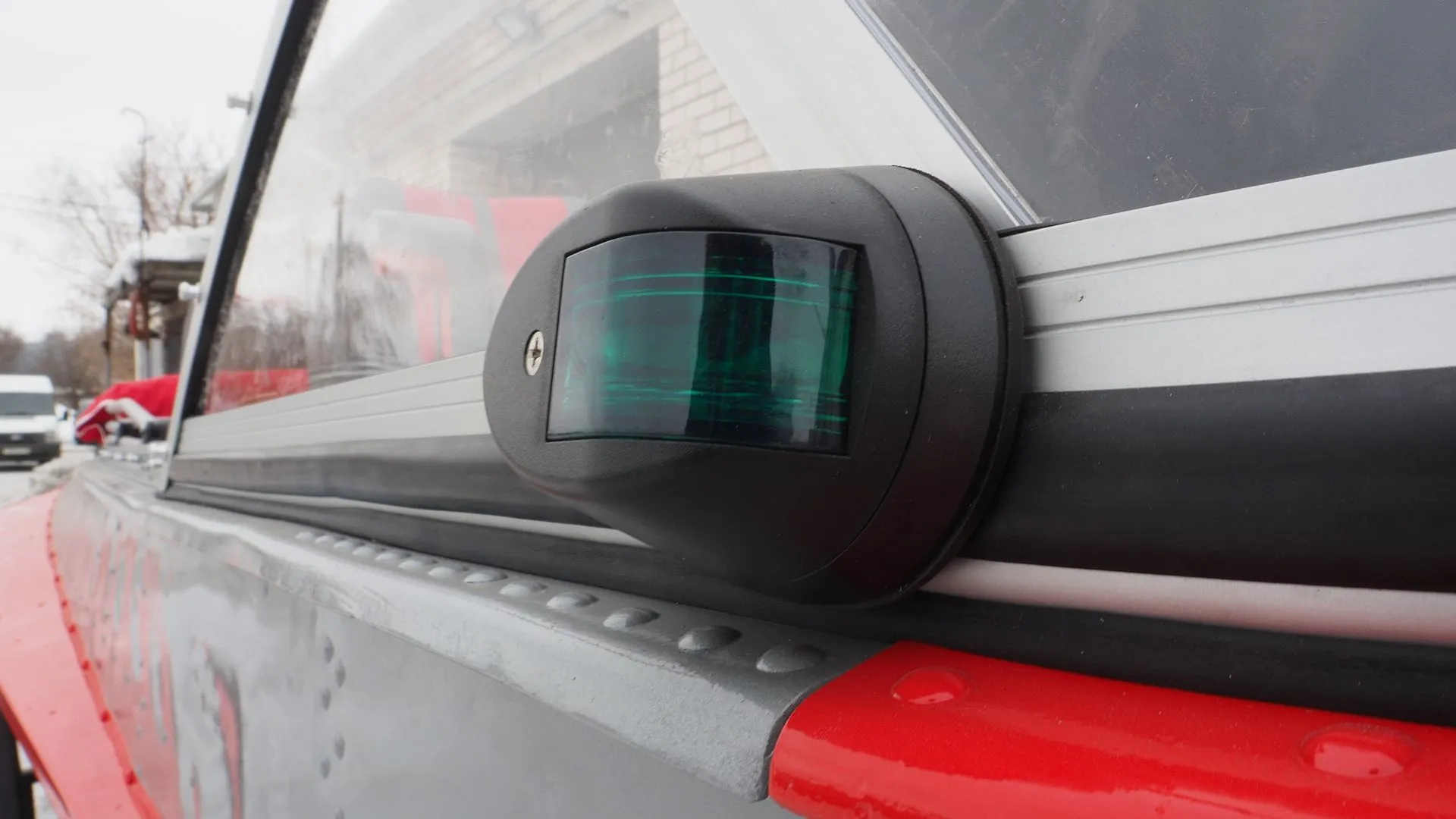 В качестве ветрового стекла, заказчиком была выбрана модель «Элит» с остеклением из акрила и рамкой из анодированного алюминиевого профиля. На который, чуть позже были установлены ходовые огни.