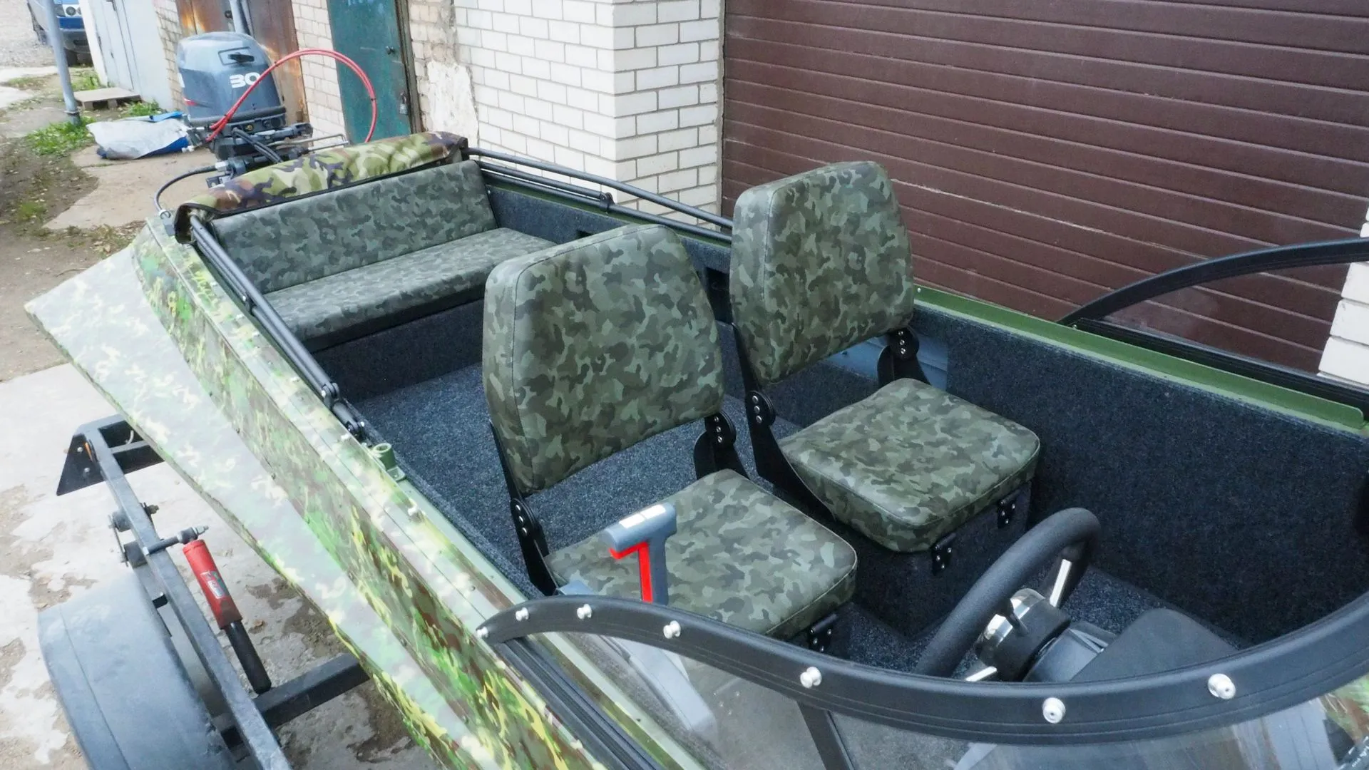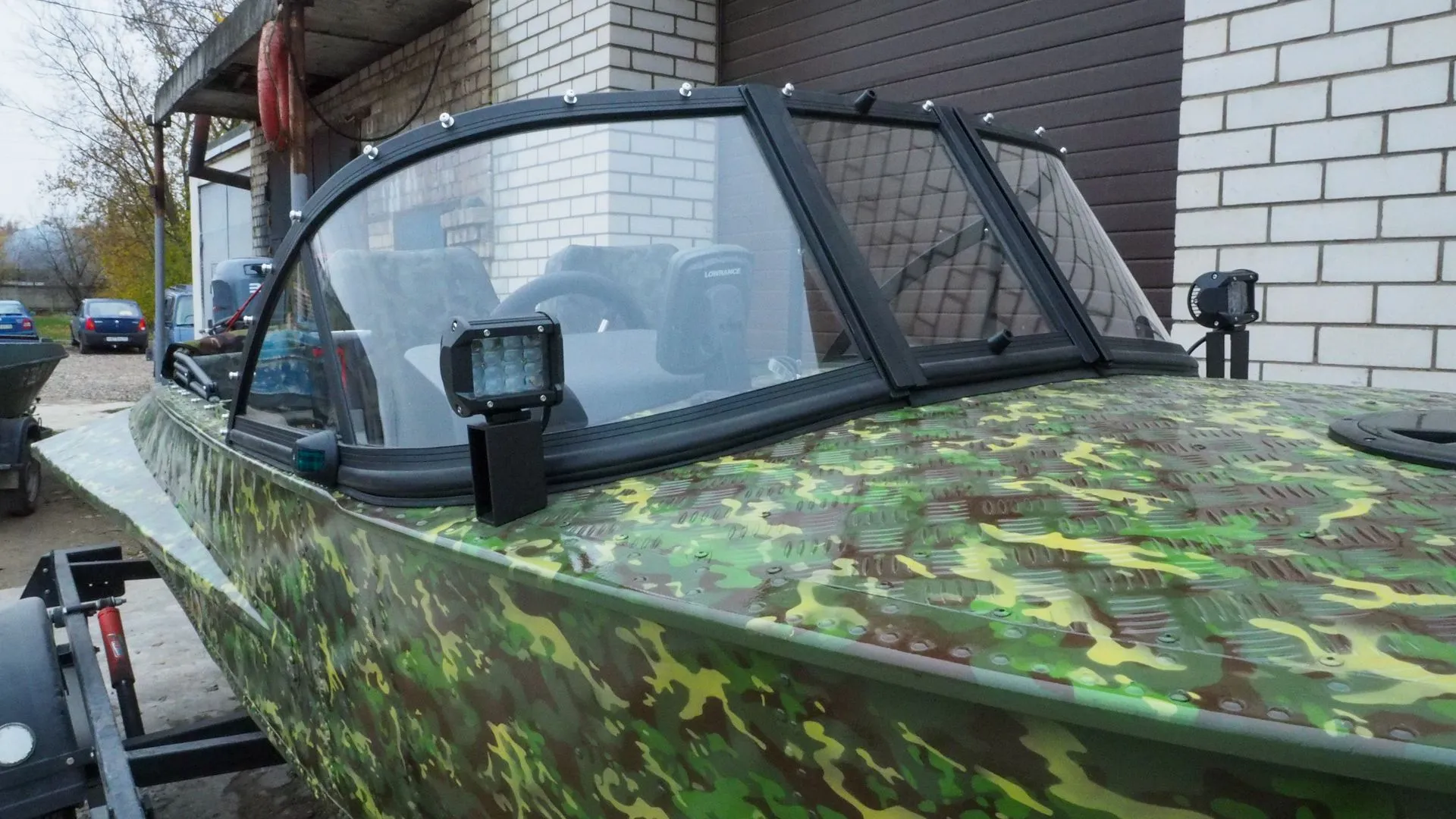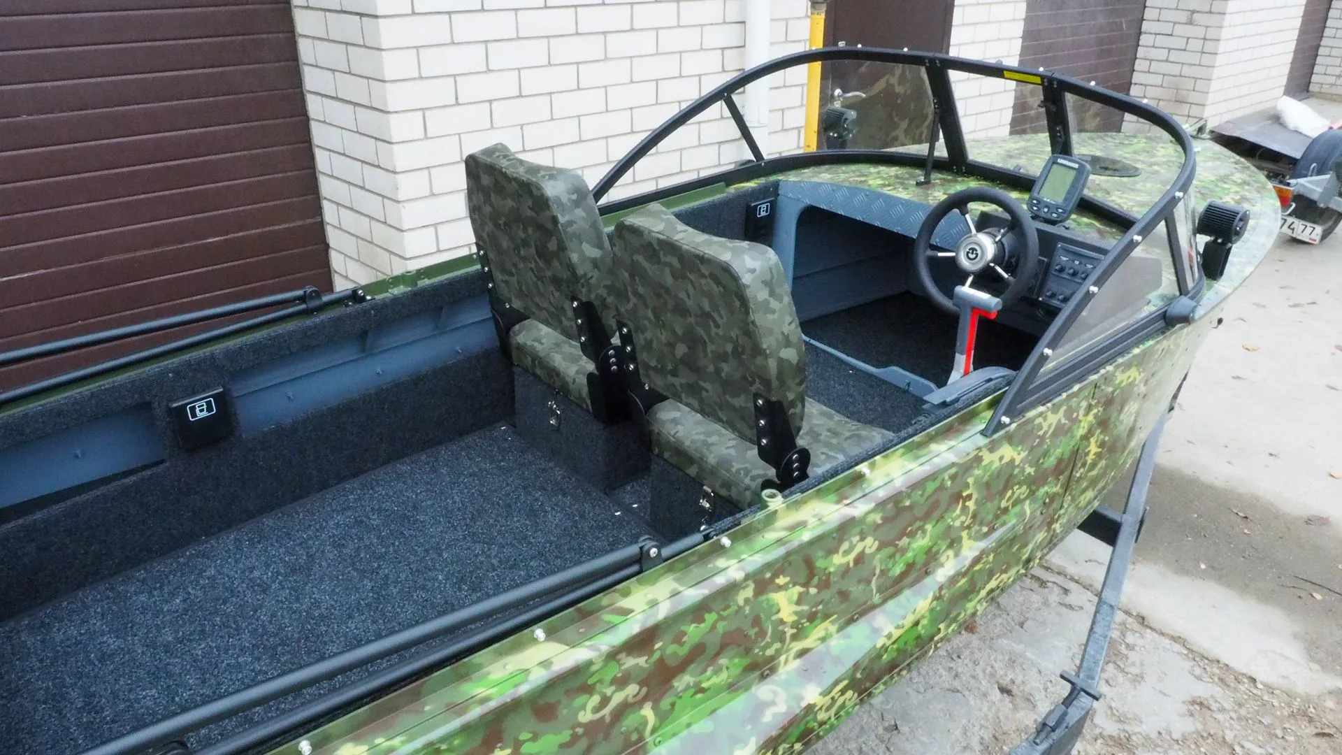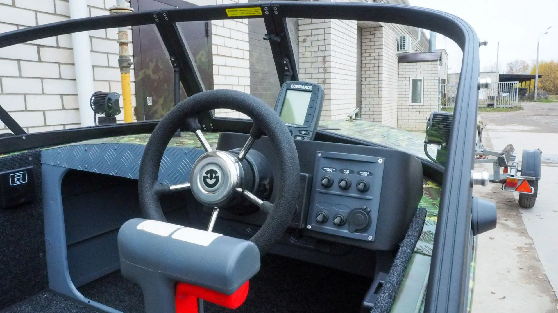 На этапе сборки, на лодку было установлено ветровое стекло «Элит» с окраской профиля в черный мат, удлиненными боковинами и остеклением из акрила.