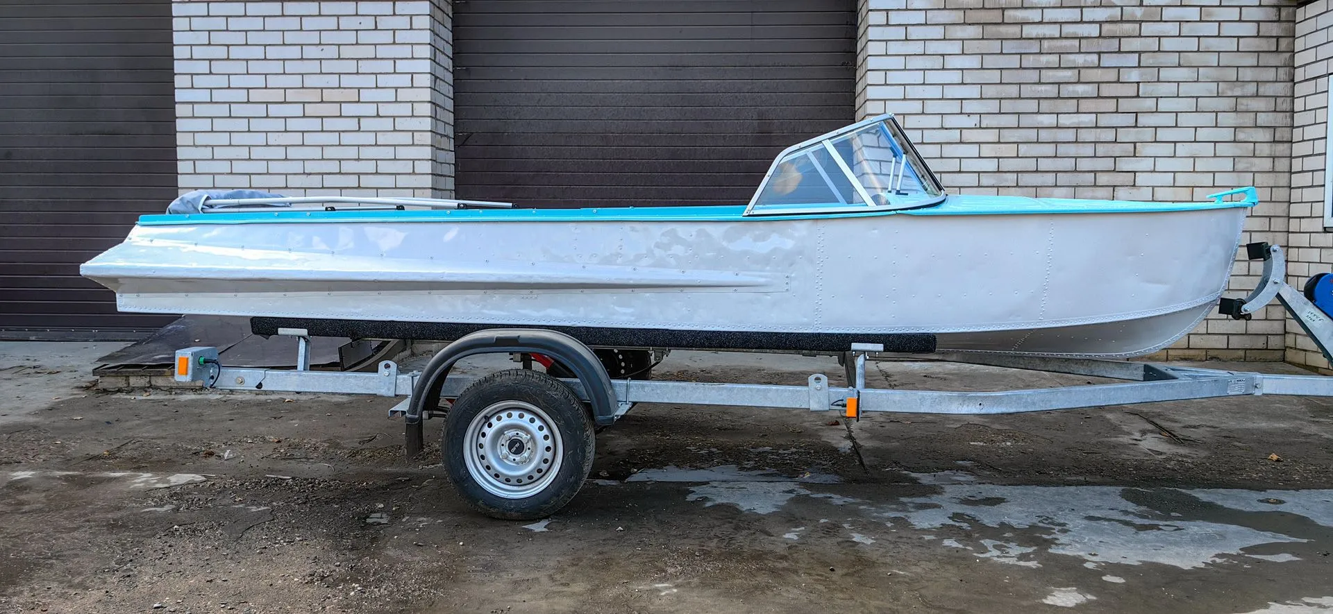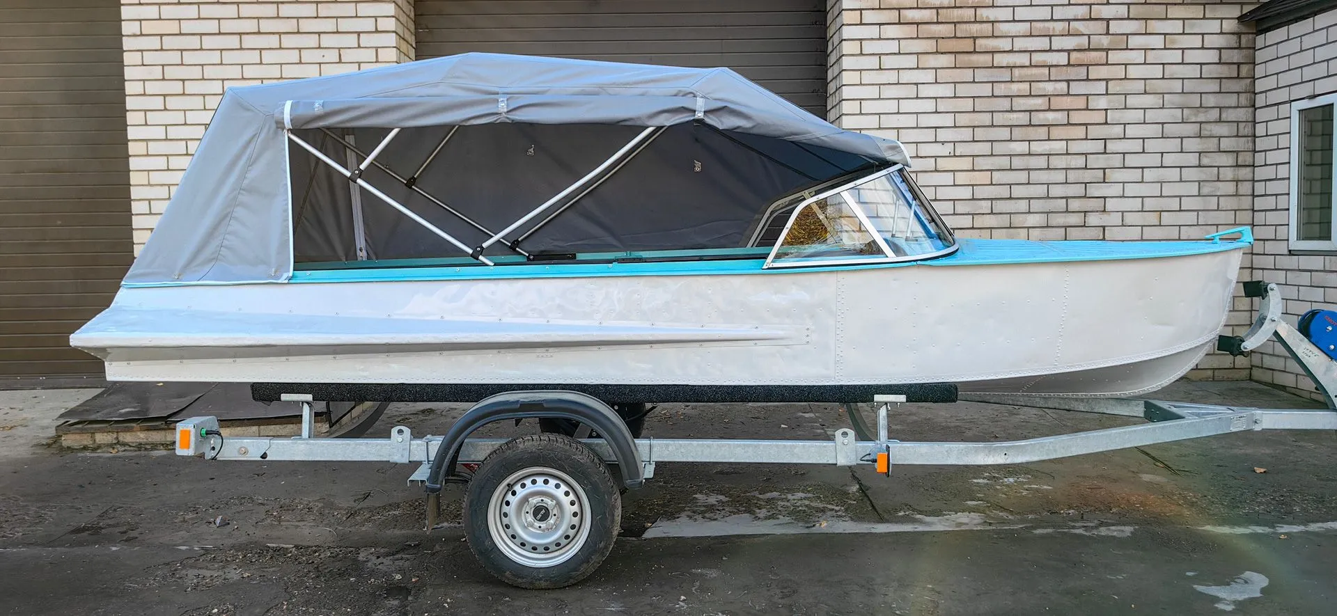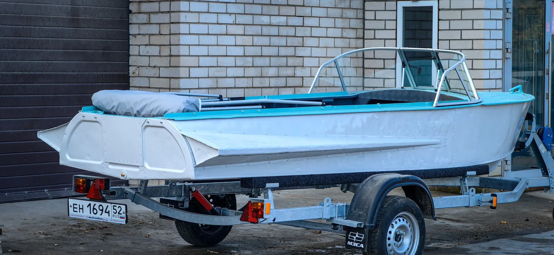 (2023) Казанка-М Комфорт Ветровое стекло Комфорт с боковиной Классик, тент Ходовой, покраска в бело-бирюзовый