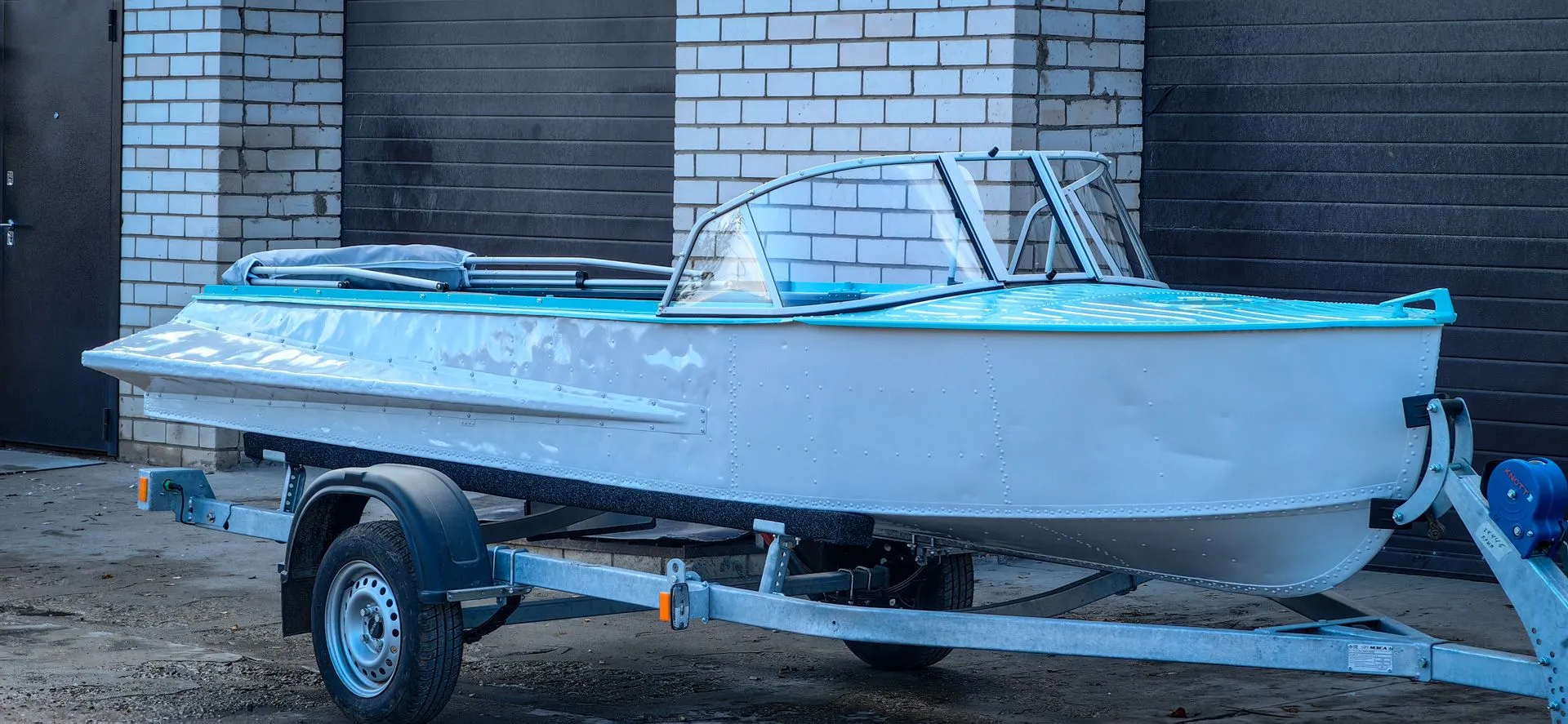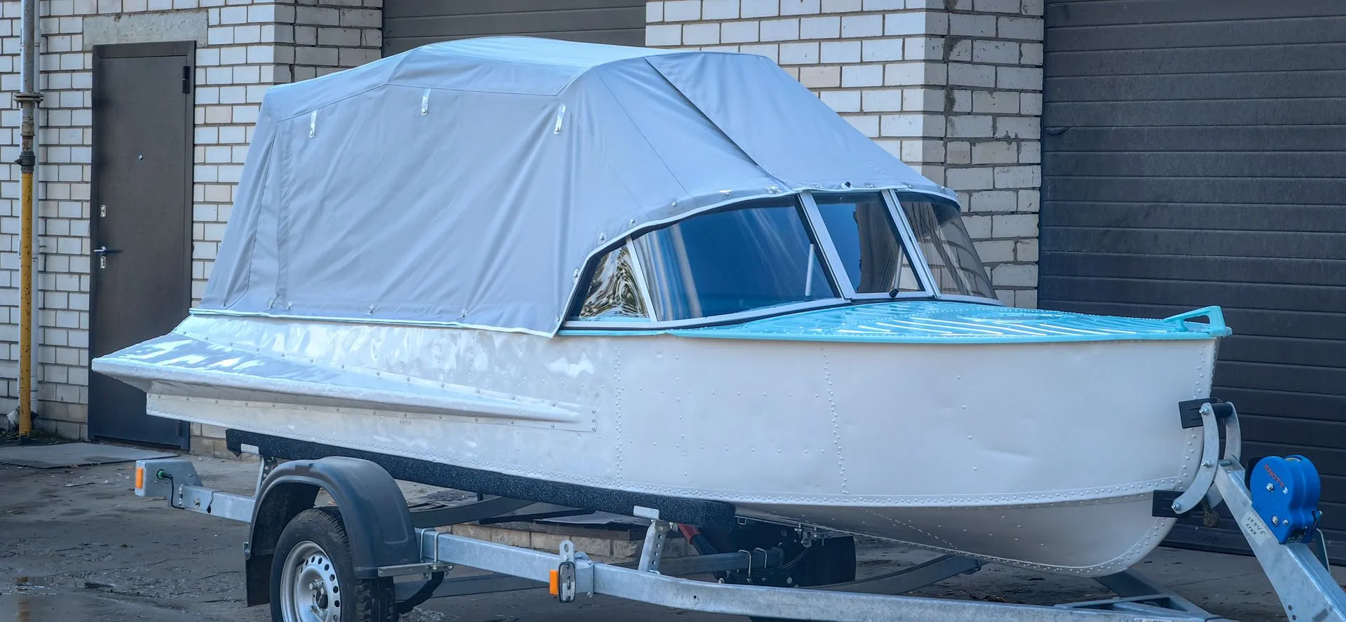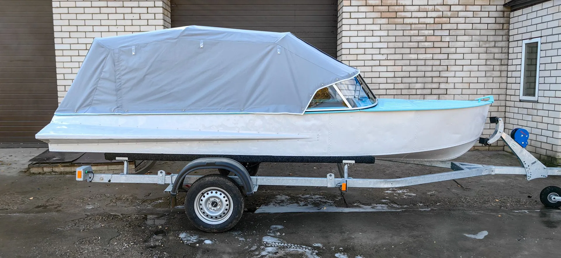 (2023) Казанка-М Комфорт Ветровое стекло Комфорт с боковиной Классик, тент Ходовой, покраска в бело-бирюзовый
