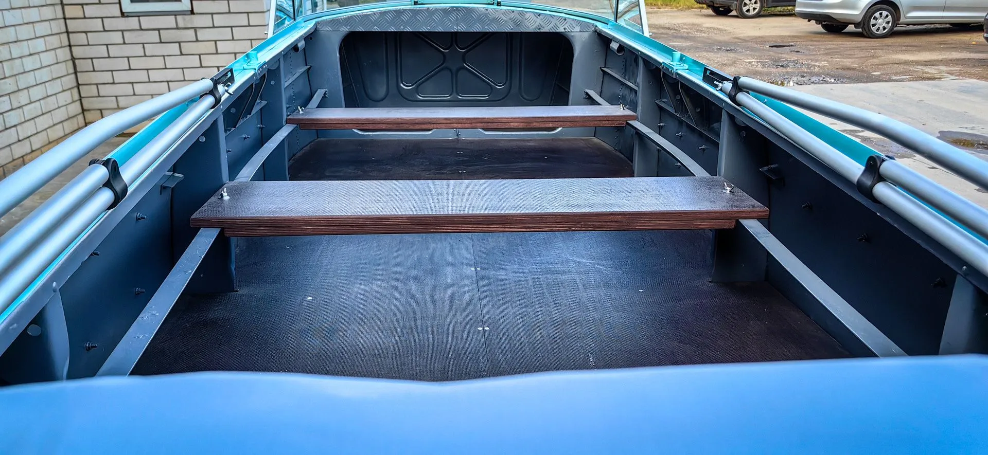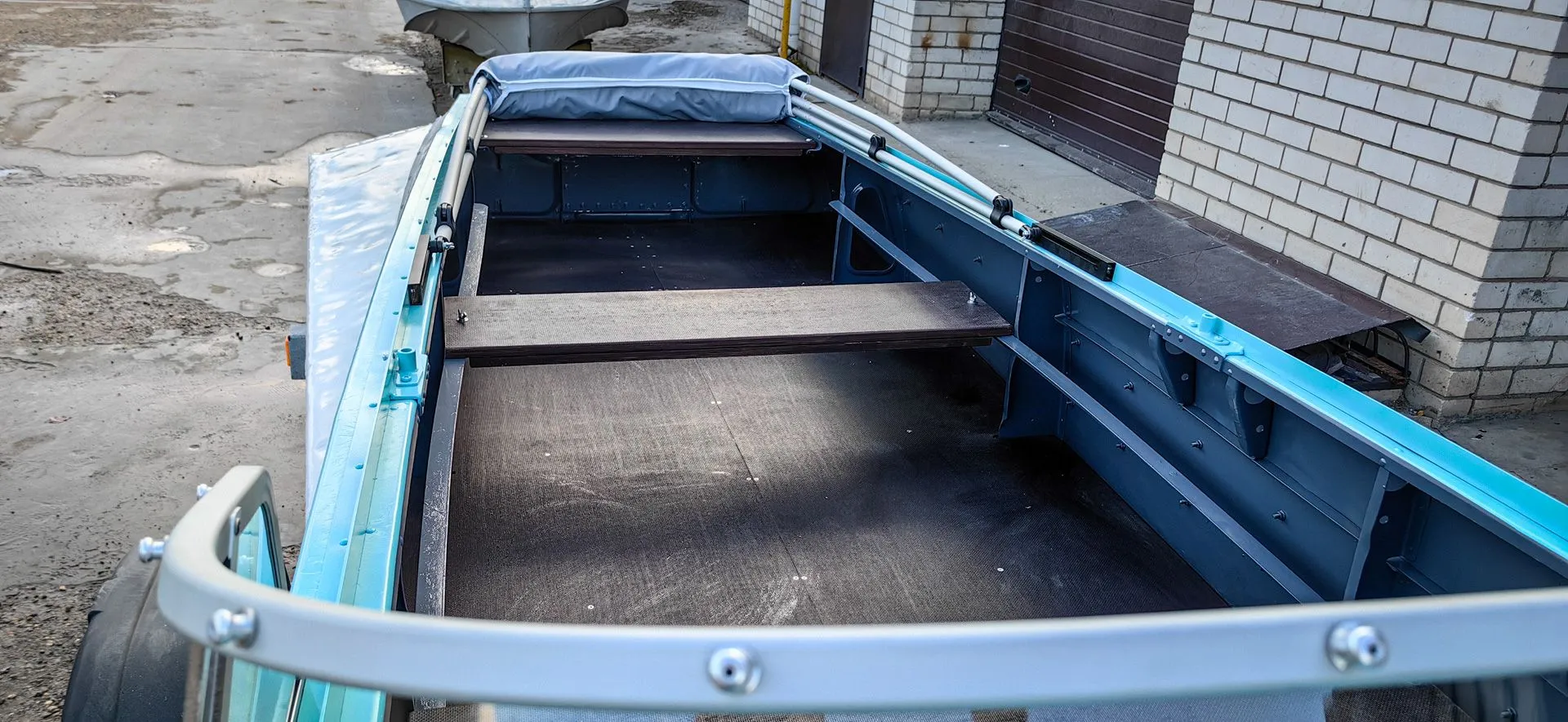 На этапе сборки в лодку был установлен новый пайол из влагостойкой ламинированной фанеры, который мы смонтировали на подготовленный ранее усиливающий каркас.