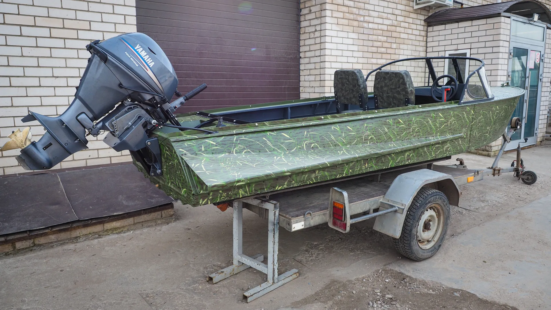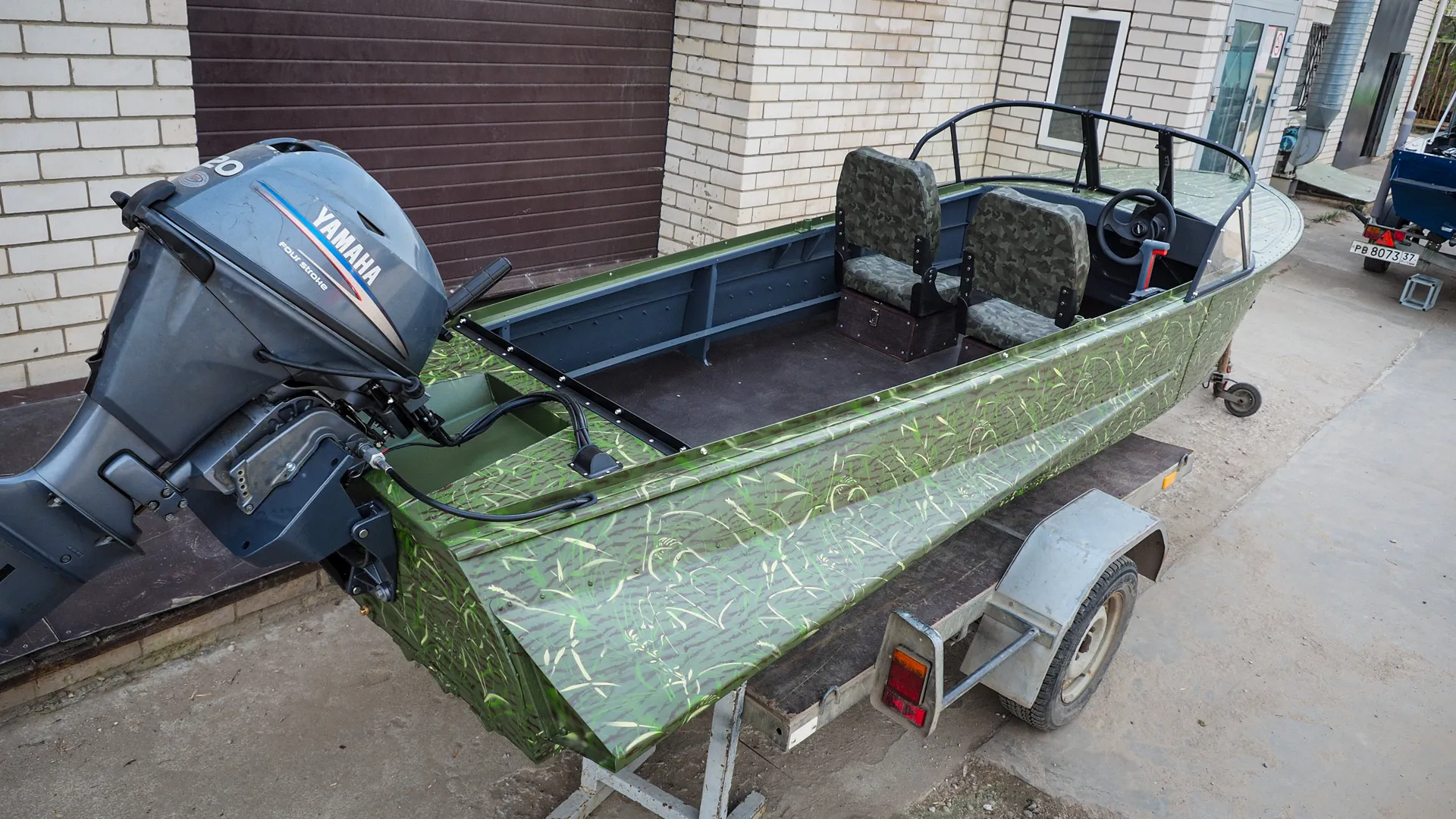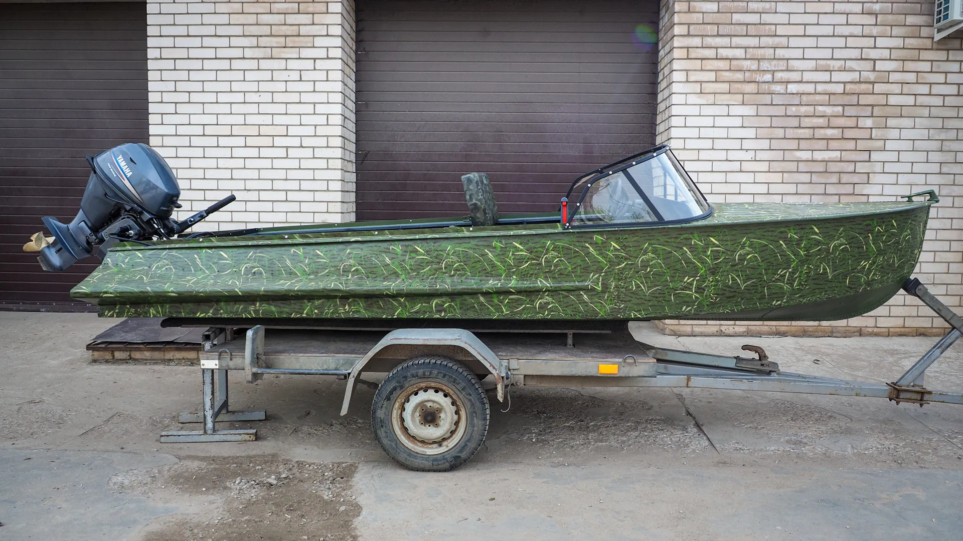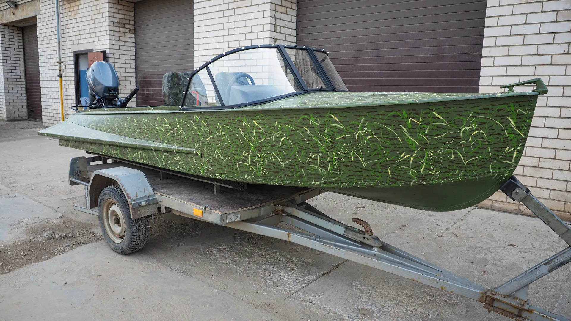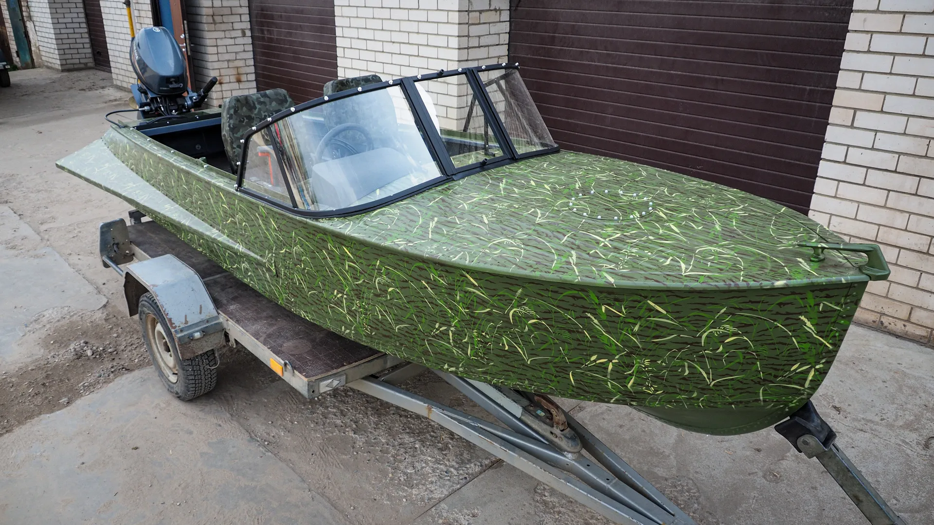 (2024) Казанка М Ветровое стекло Комфорт с боковиной Классик, покраска в зеленый камуфляж