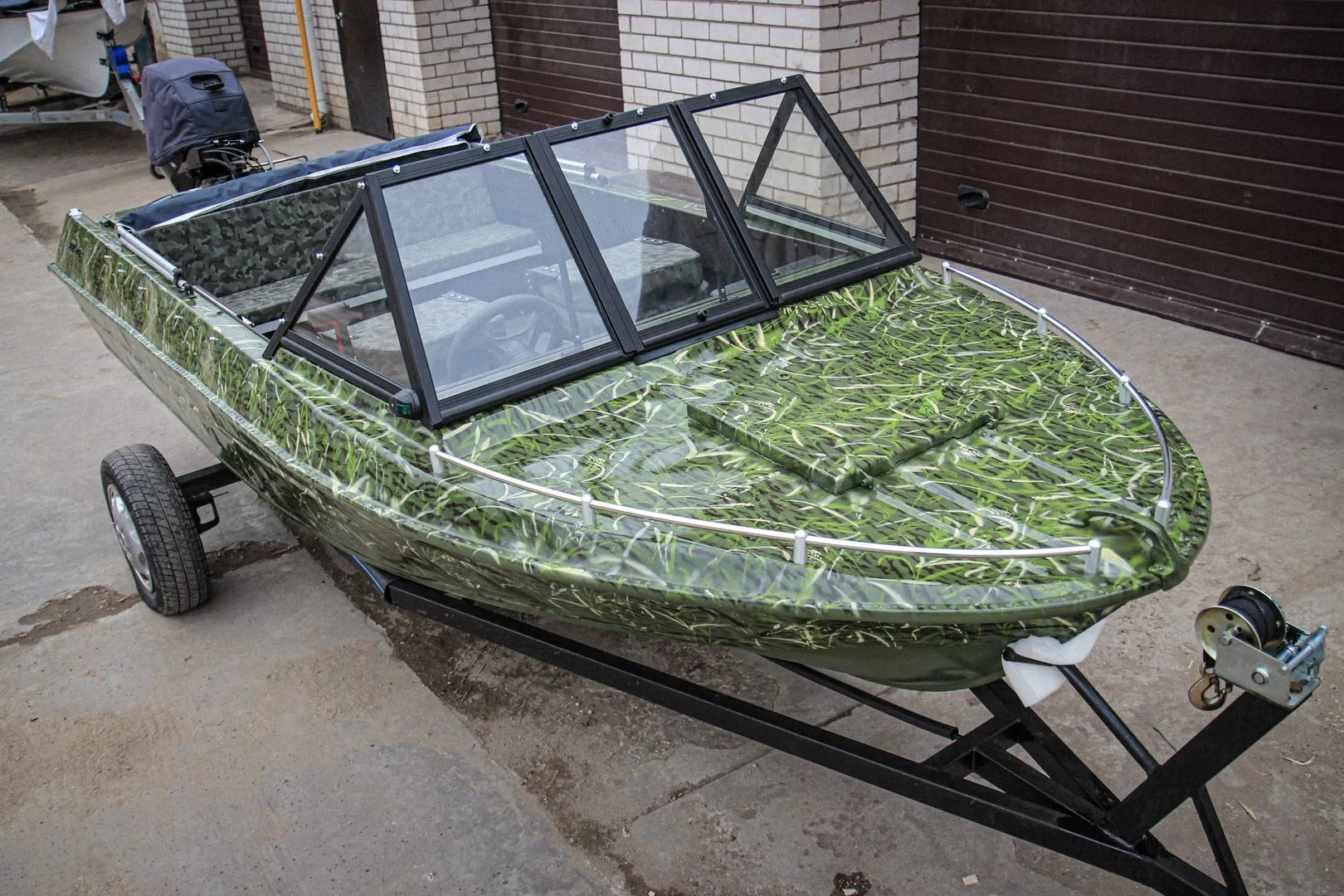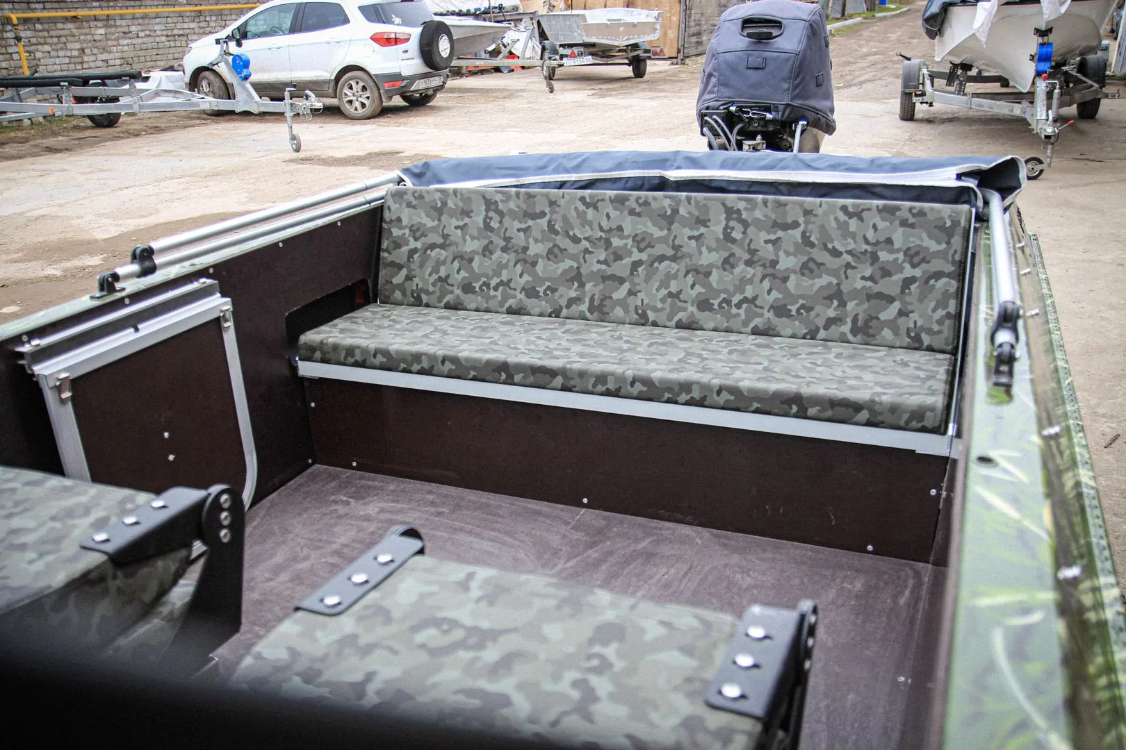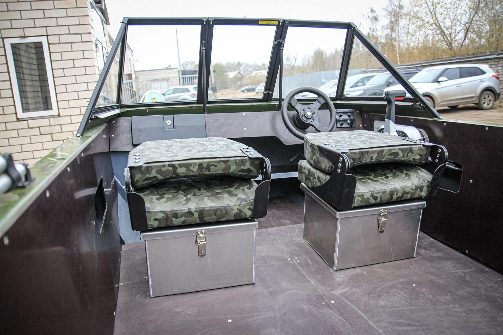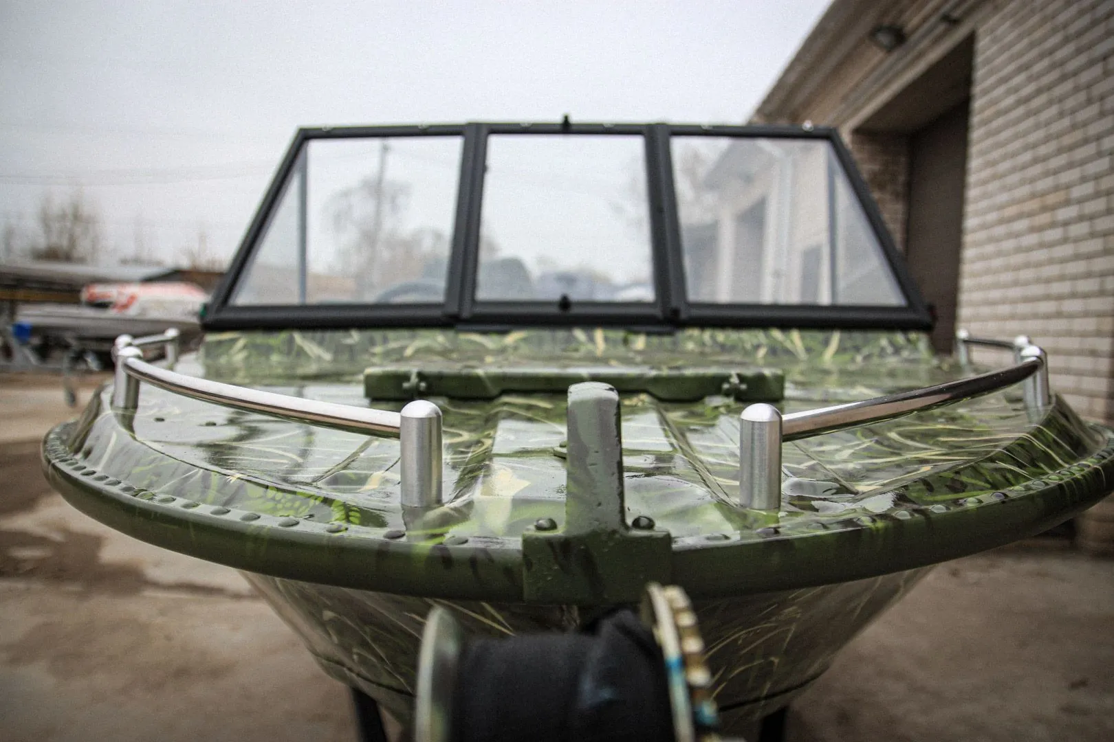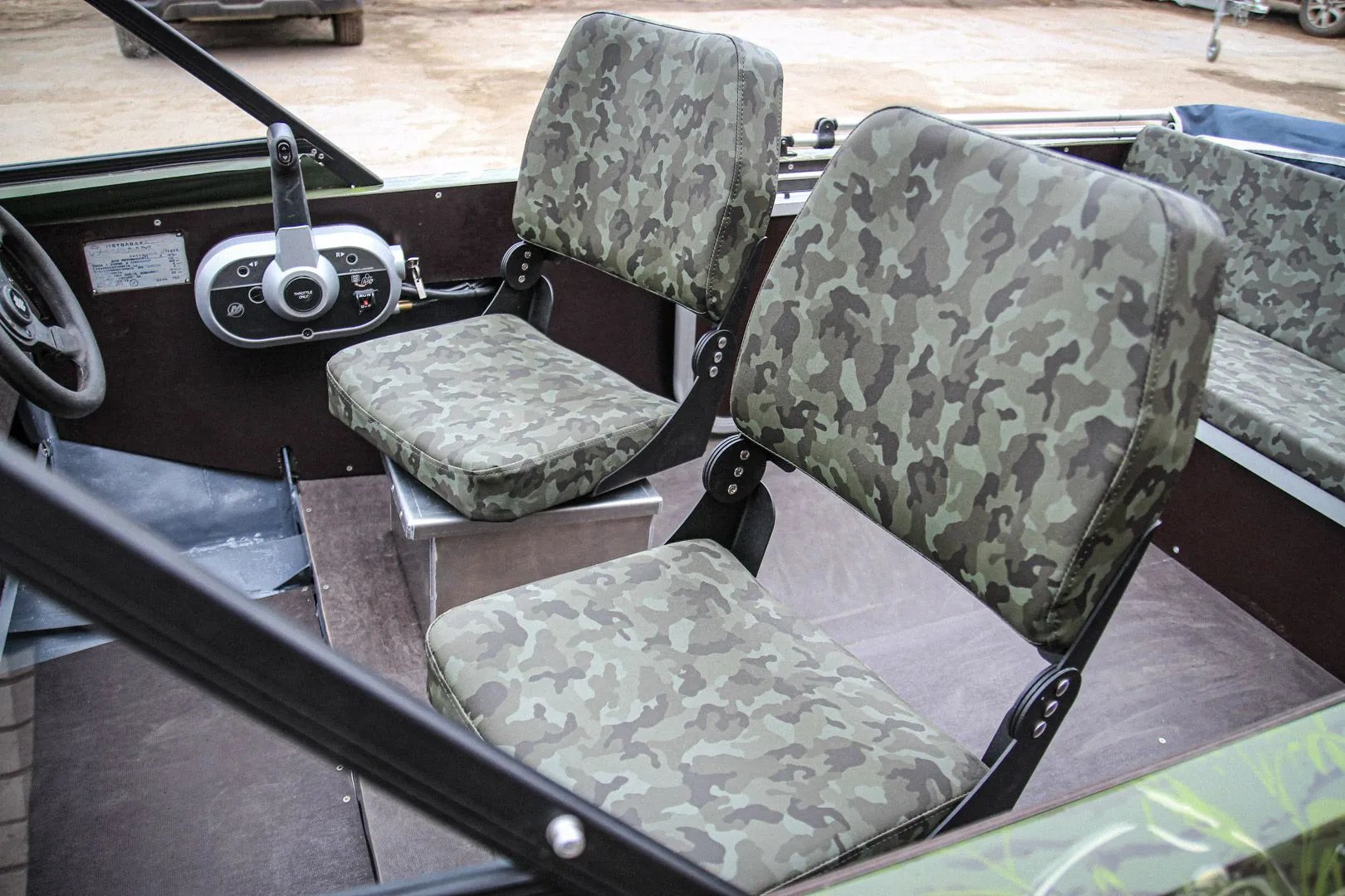 Закончив основные работы с корпусом, мы приступили к шлифовке корпуса и подготовке к покраске. Окрасив лодку в самый популярный из используемых нами камуфляжей, мы приступили к сборке. Установили ветровое стекло модели «Премиум» с закаленным стеклом и полимерной окраской рамки в чёрный мат. Передние сидения с обшивкой из судового винила, установили на алюминиевые рундуки через поворотные проставки. Изготовили задний диван-рундук и обшили его той же тканью, что и передние сидения. На обшивке правого борта разместили небольшой столик. Установили двигатель. Сделали базовую электропроводку и изготовили ходовой тент.