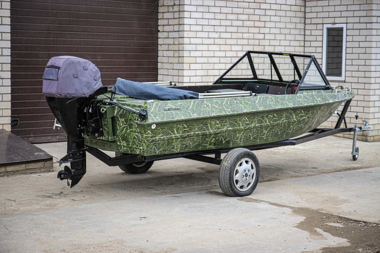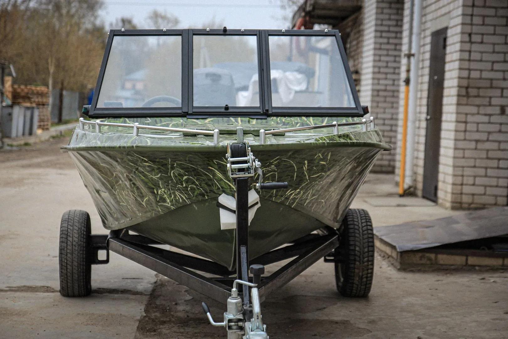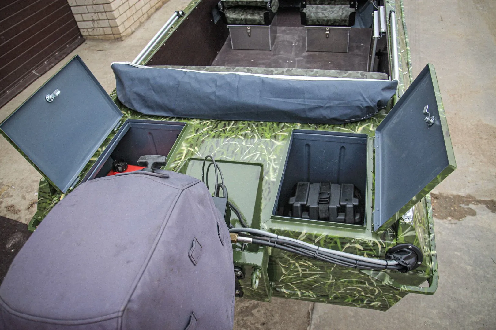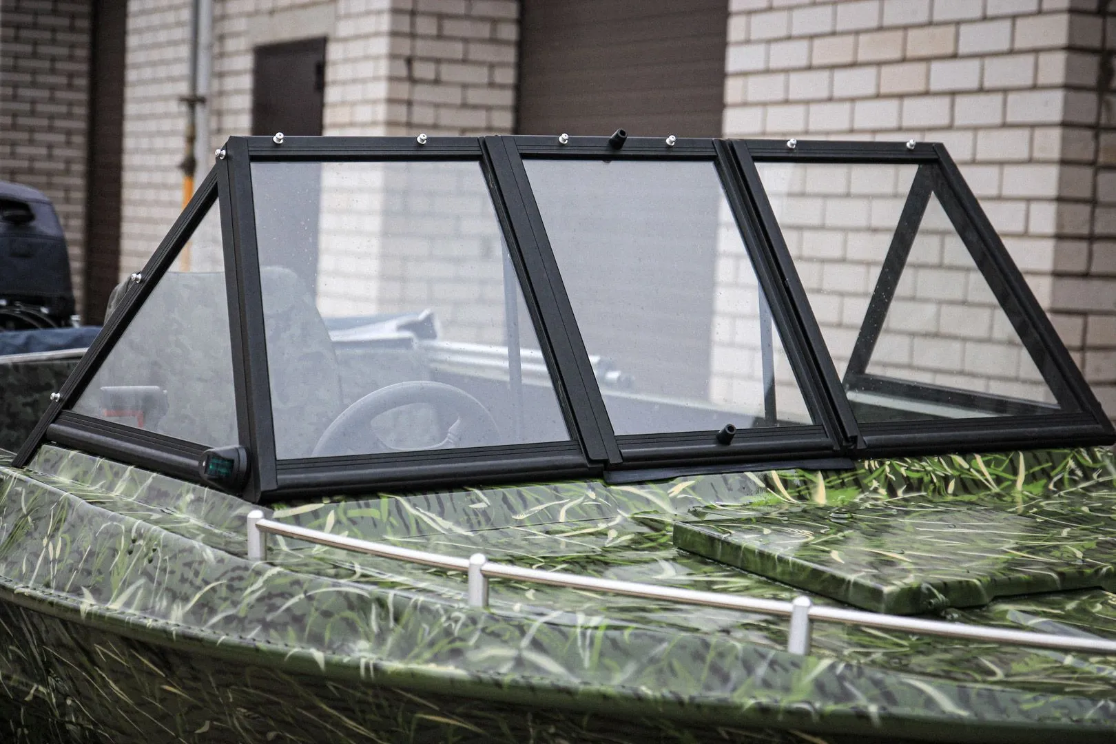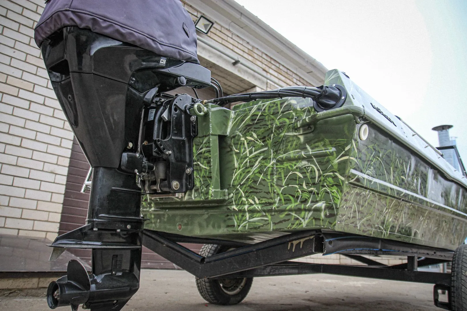 Закончив основные работы с корпусом, мы приступили к шлифовке корпуса и подготовке к покраске. Окрасив лодку в самый популярный из используемых нами камуфляжей, мы приступили к сборке. Установили ветровое стекло модели «Премиум» с закаленным стеклом и полимерной окраской рамки в чёрный мат. Передние сидения с обшивкой из судового винила, установили на алюминиевые рундуки через поворотные проставки. Изготовили задний диван-рундук и обшили его той же тканью, что и передние сидения. На обшивке правого борта разместили небольшой столик. Установили двигатель. Сделали базовую электропроводку и изготовили ходовой тент.