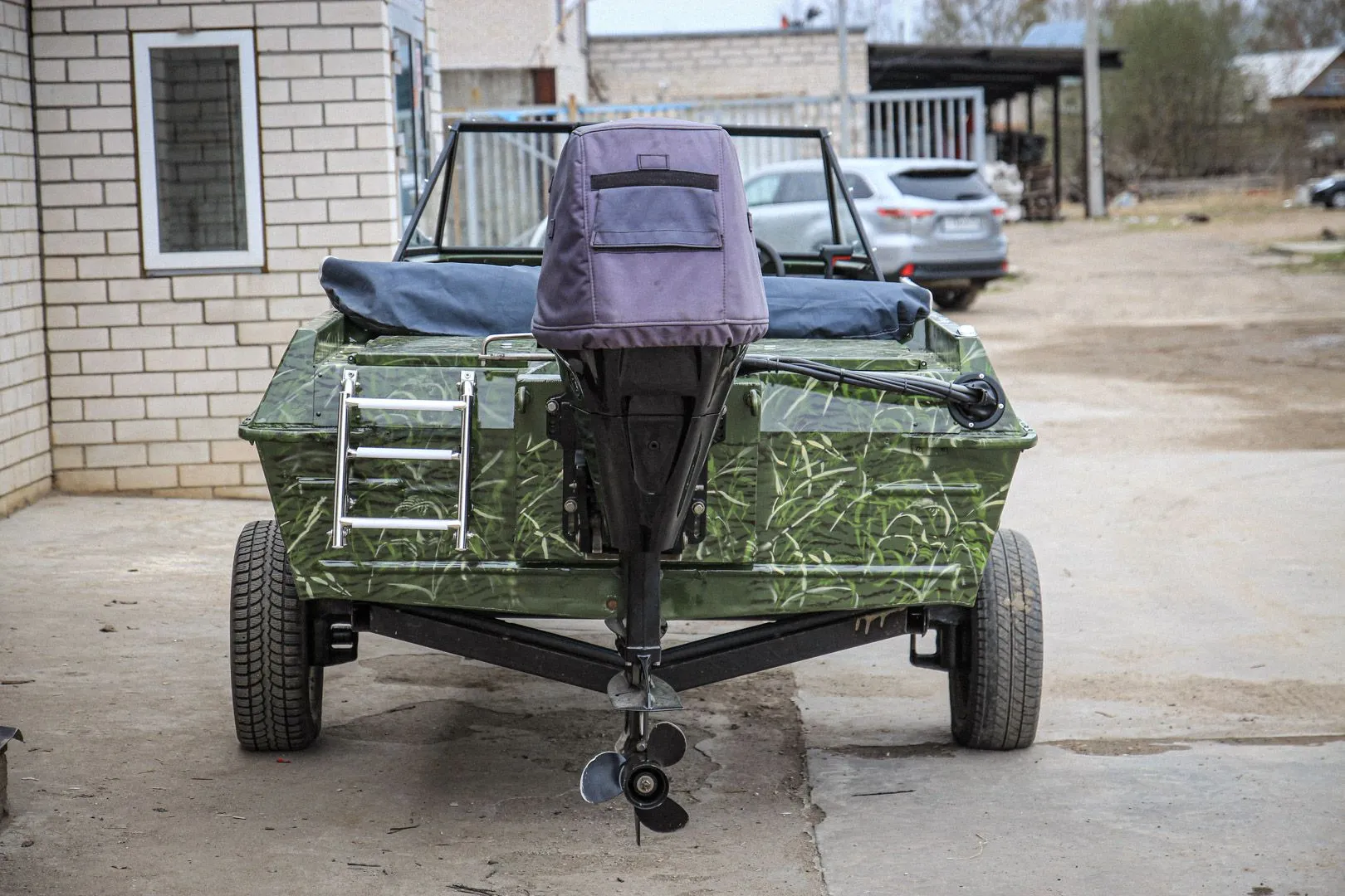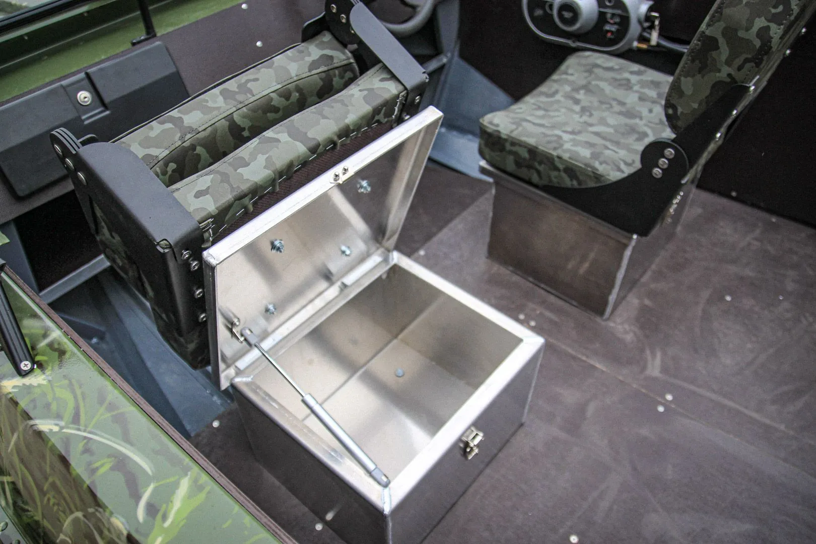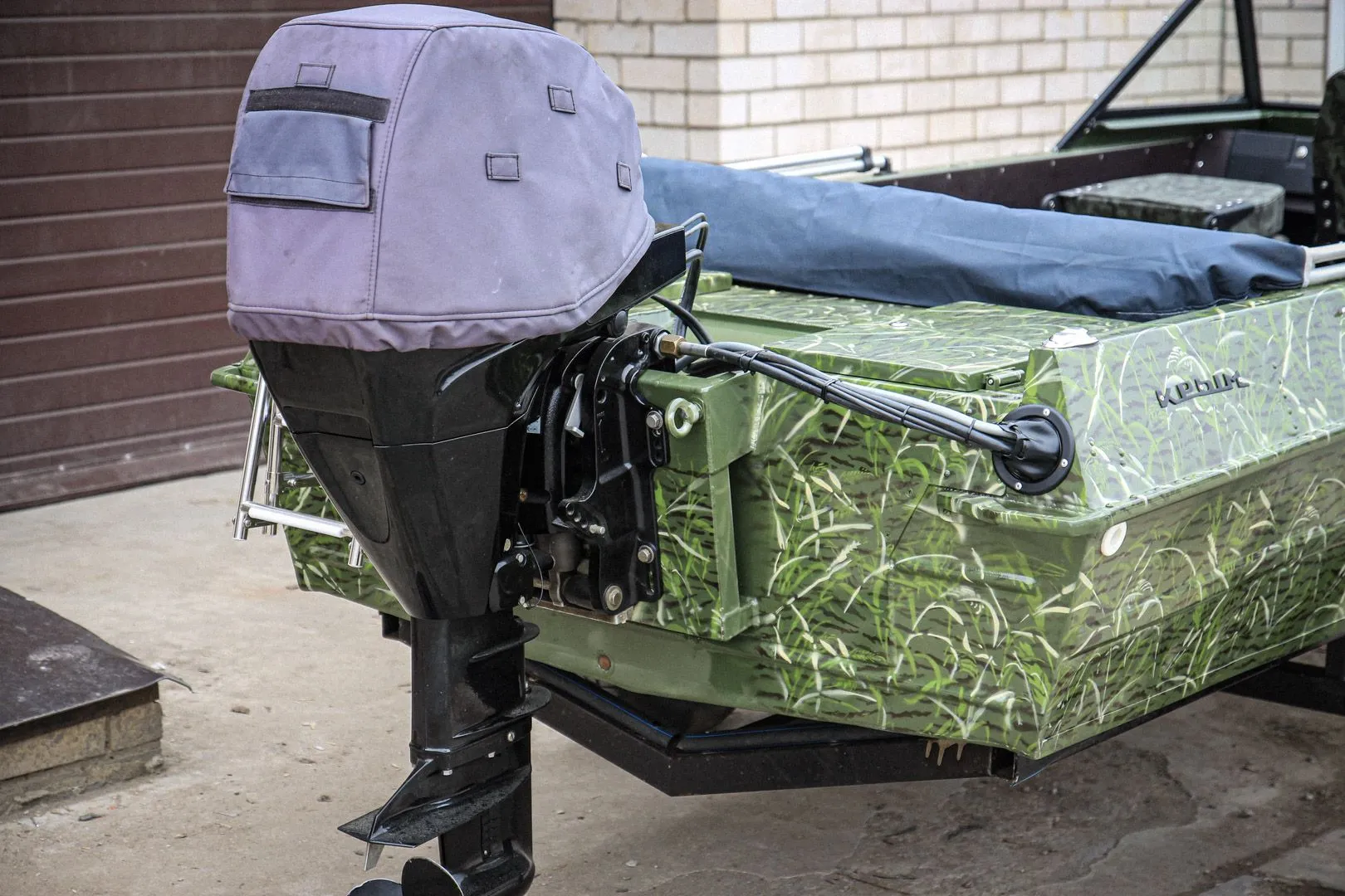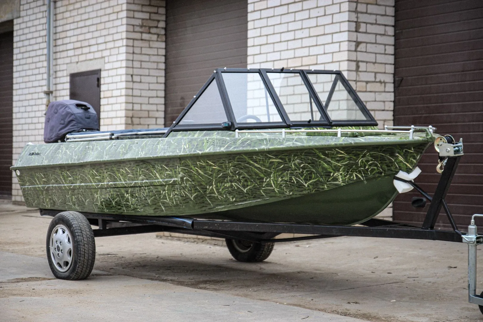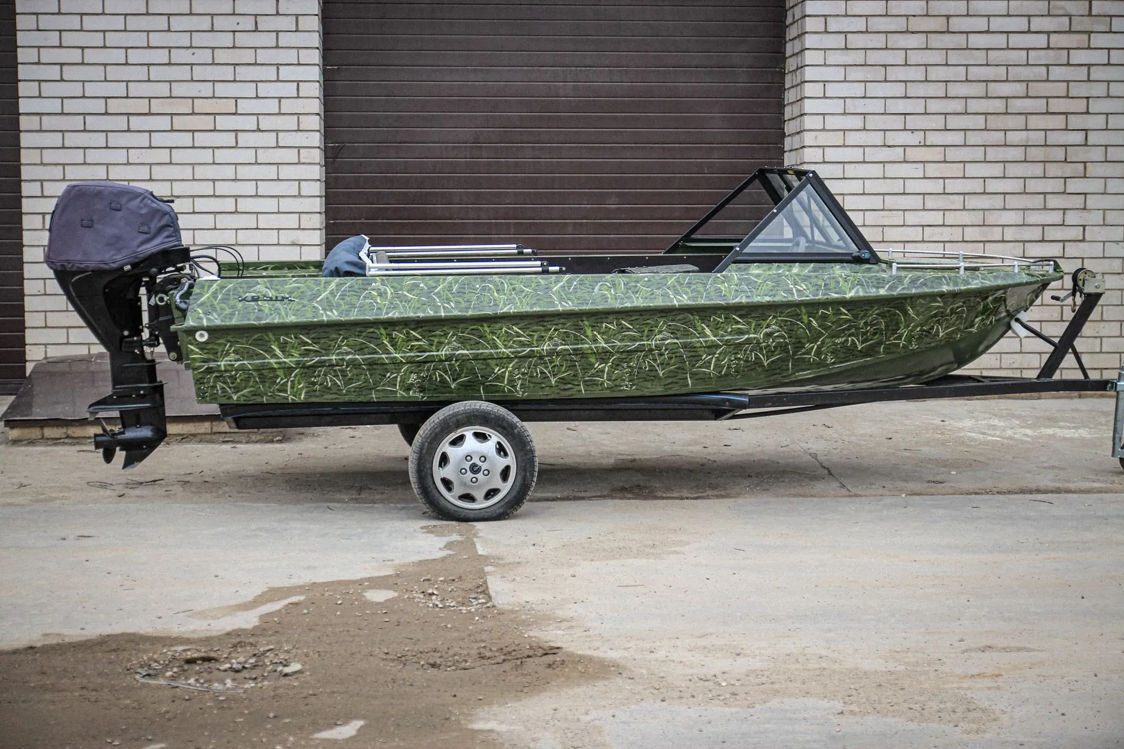 Закончив основные работы с корпусом, мы приступили к шлифовке корпуса и подготовке к покраске. Окрасив лодку в самый популярный из используемых нами камуфляжей, мы приступили к сборке. Установили ветровое стекло модели «Премиум» с закаленным стеклом и полимерной окраской рамки в чёрный мат. Передние сидения с обшивкой из судового винила, установили на алюминиевые рундуки через поворотные проставки. Изготовили задний диван-рундук и обшили его той же тканью, что и передние сидения. На обшивке правого борта разместили небольшой столик. Установили двигатель. Сделали базовую электропроводку и изготовили ходовой тент.