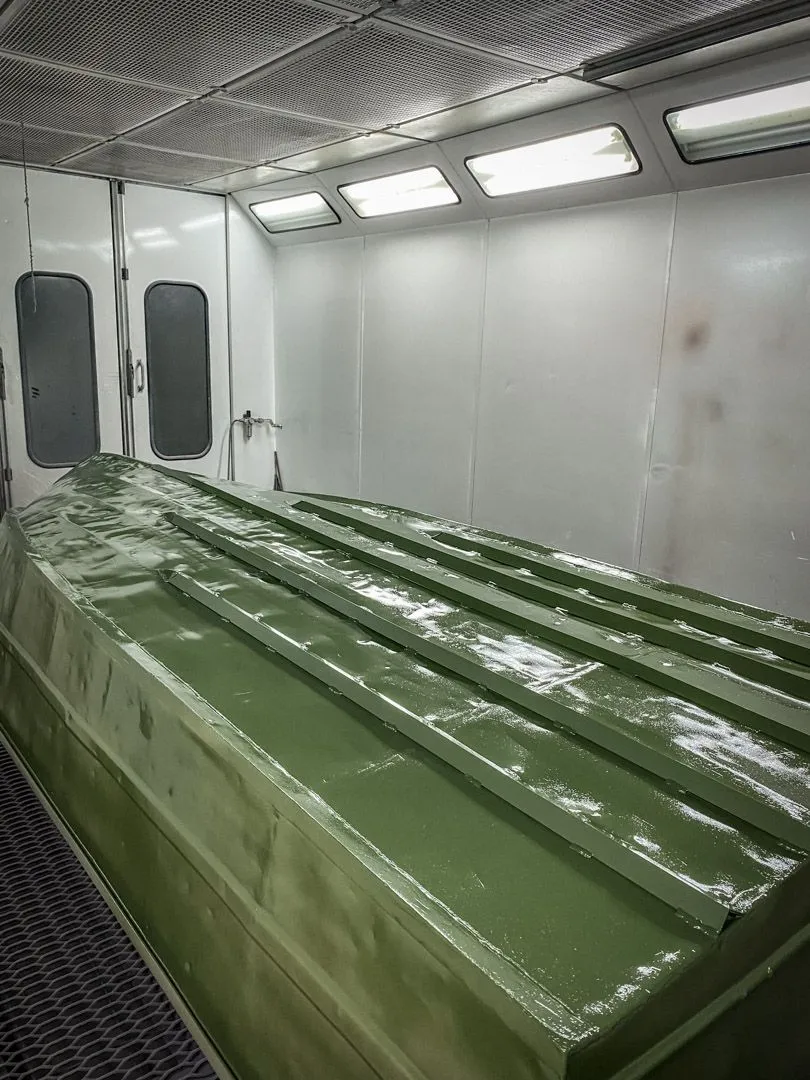 Завершив доработки, корпус был подготовлен и покрашен в камуфляж камыш стандартных цветов, с покрытием глянцевым лаком.