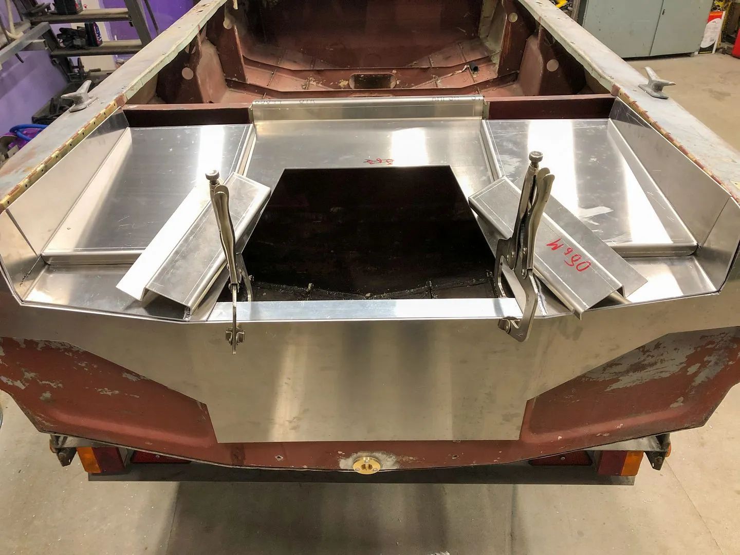В нем стандартная доска заменена на алюминиевый бокс, здесь отличная от заводской конструкция самоотливного рецесса, новые крышки рундуков и большая транцевая накладка.
