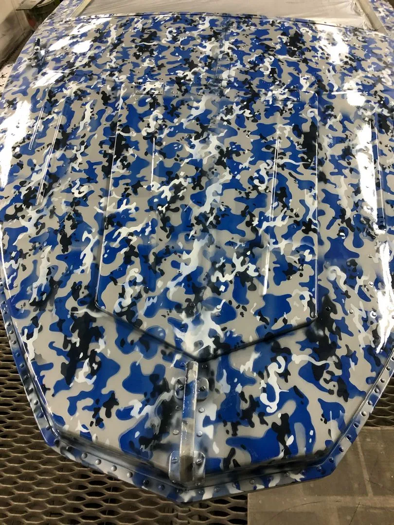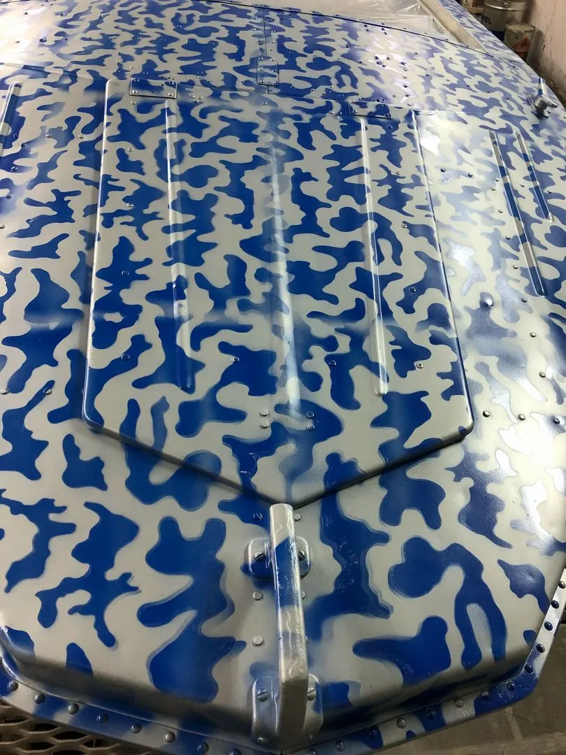 Здесь, на серый базовый слой, был нанесён трехслойный, пятнистый камуфляж с применением синего, белого и чёрного цветов. После чего было нанесено несколько защитных слоёв из глянцевого лака.