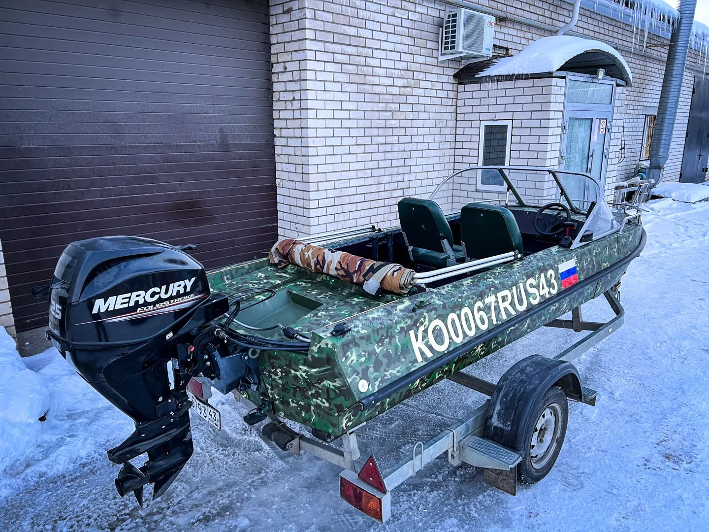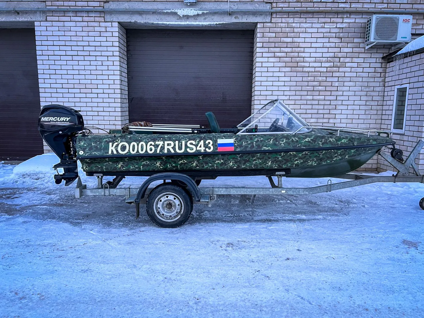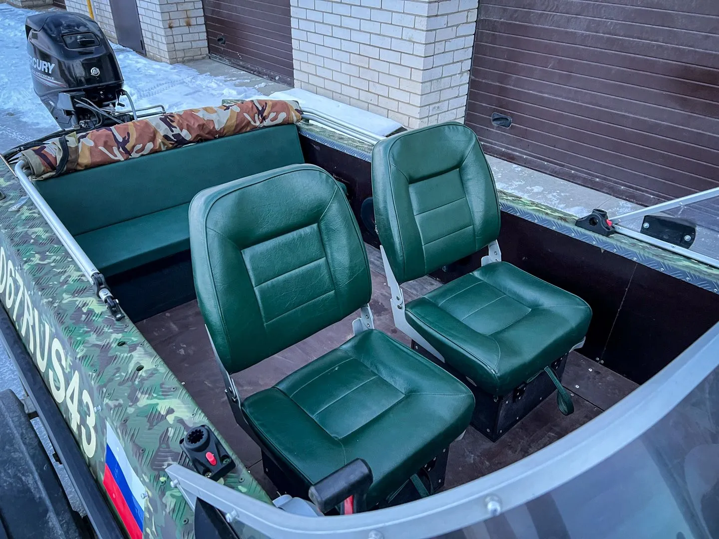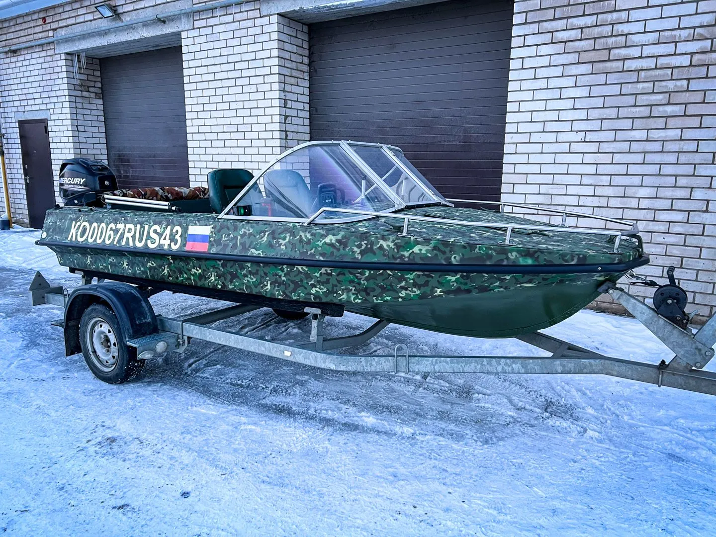 По желанию клиента, лодка была окрашена в ставший уже классическим, зелёный камуфляж с рисунком «камыш», после чего нанесли несколько слоёв матового лака.