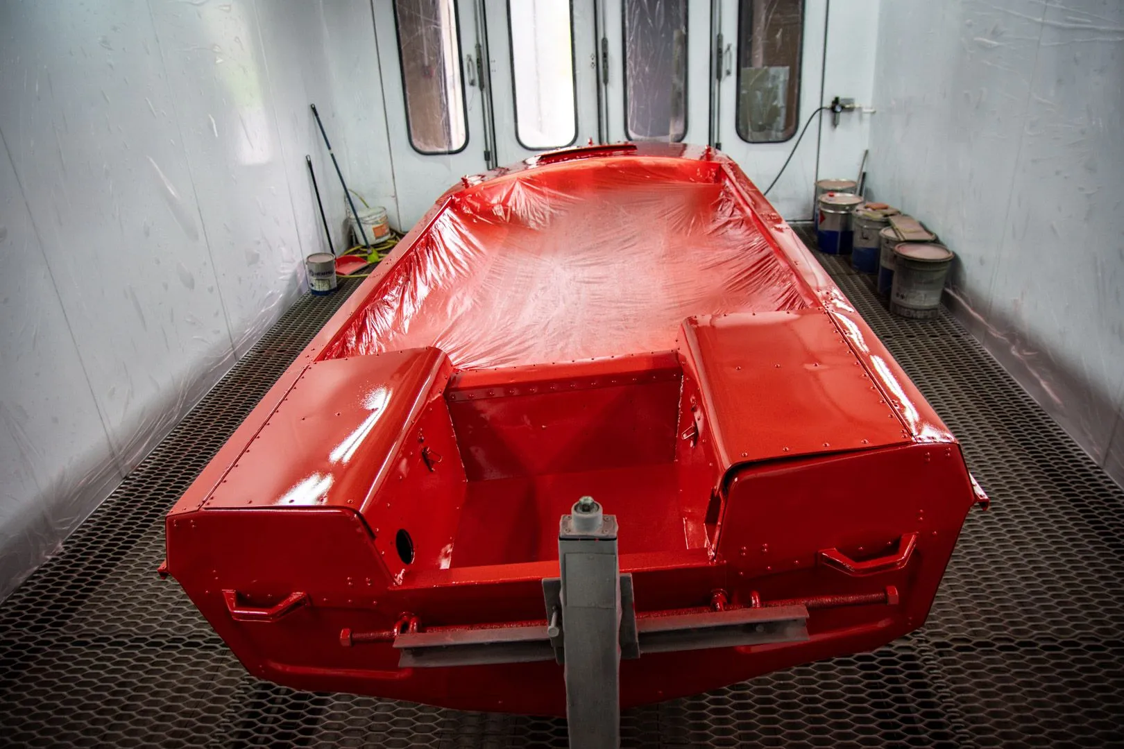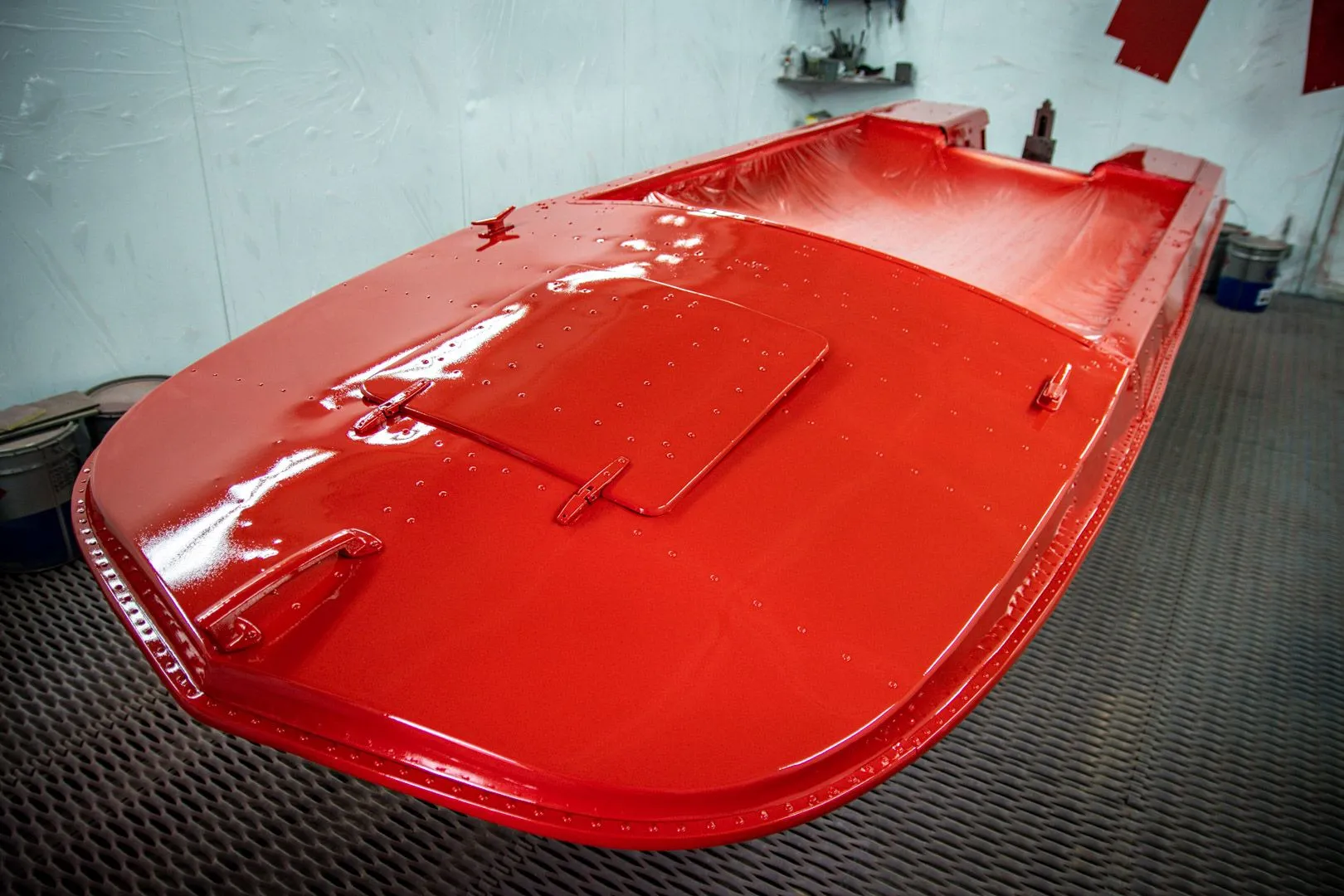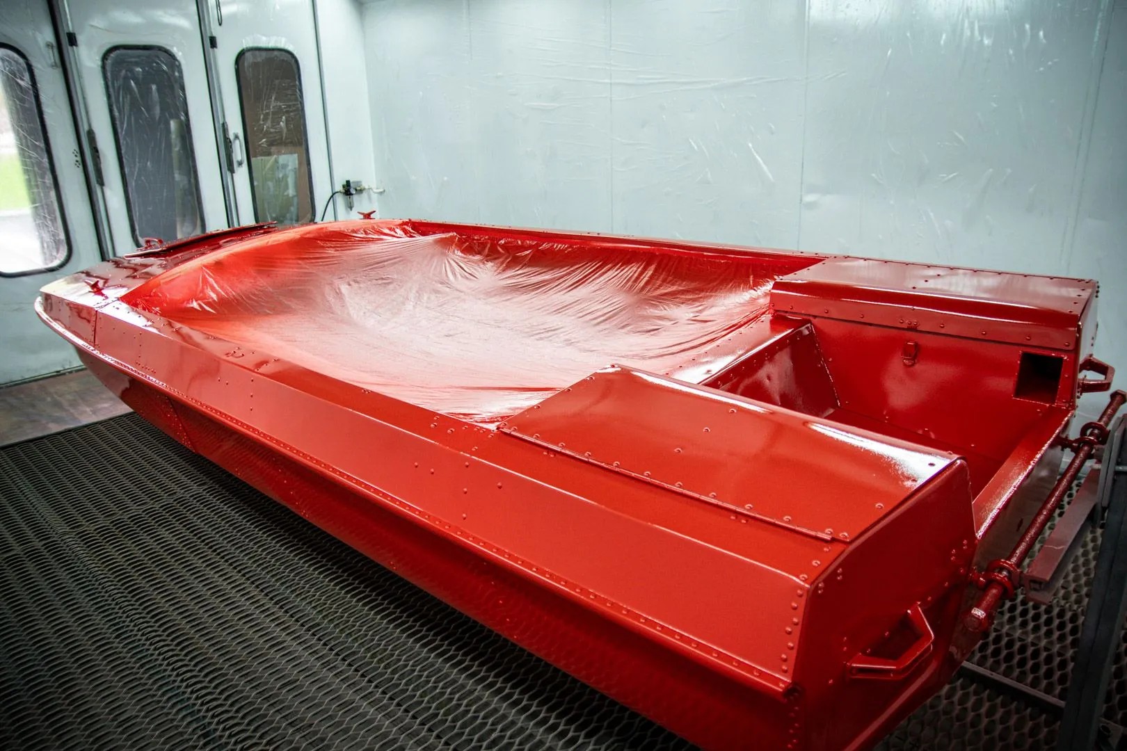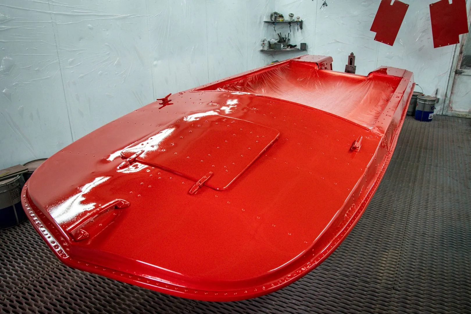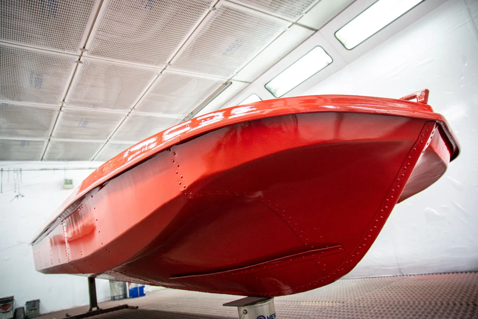Основным цветом лодки клиент выбрал яркий красный, а бортовые зашивки кокпита и механизмы сидений было решено окрасить в белый глянец.