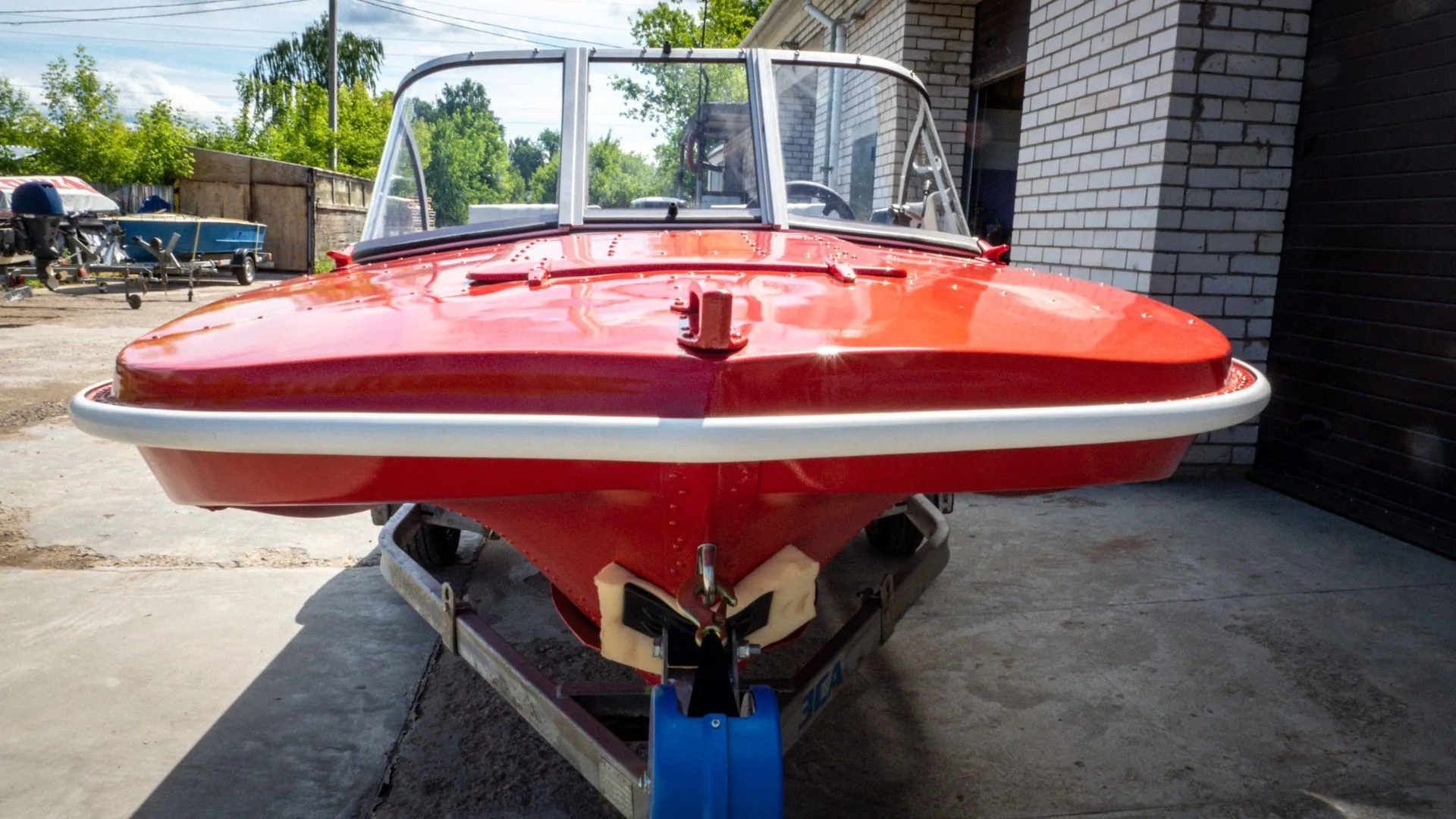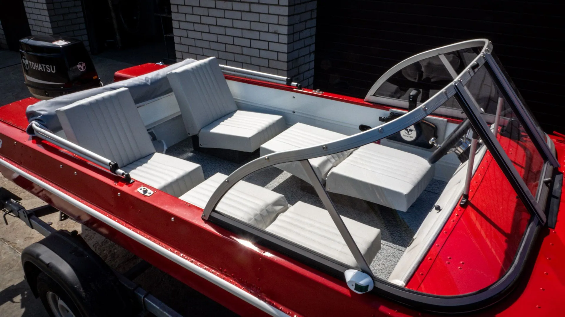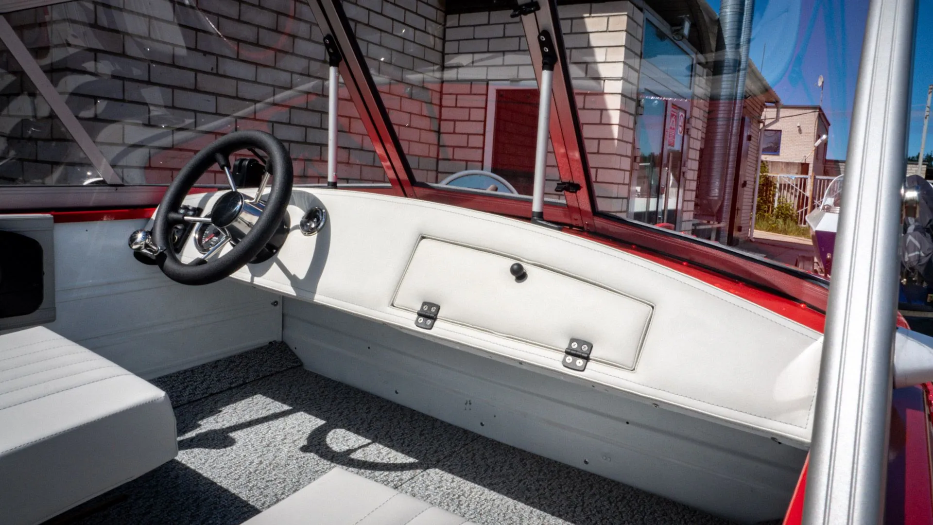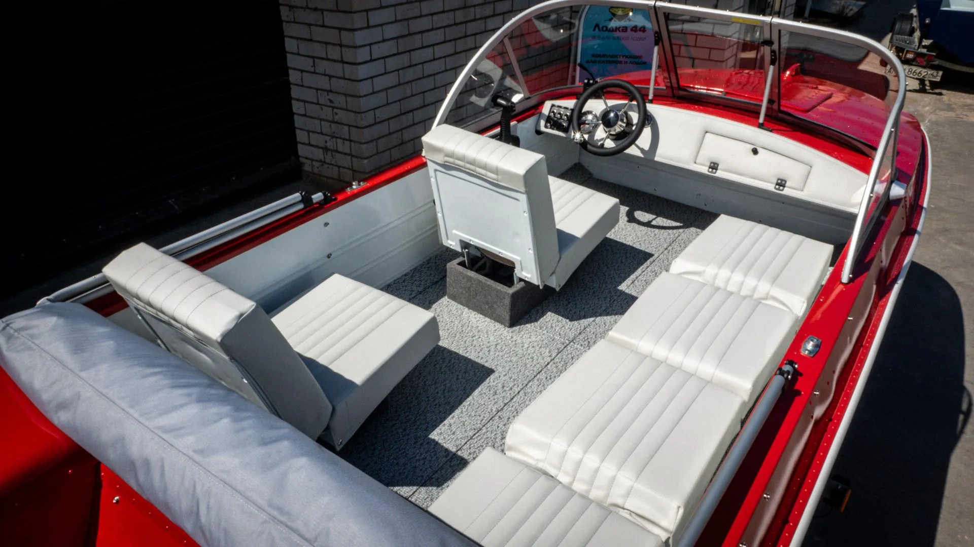 Основным цветом лодки клиент выбрал яркий красный, а бортовые зашивки кокпита и механизмы сидений было решено окрасить в белый глянец.