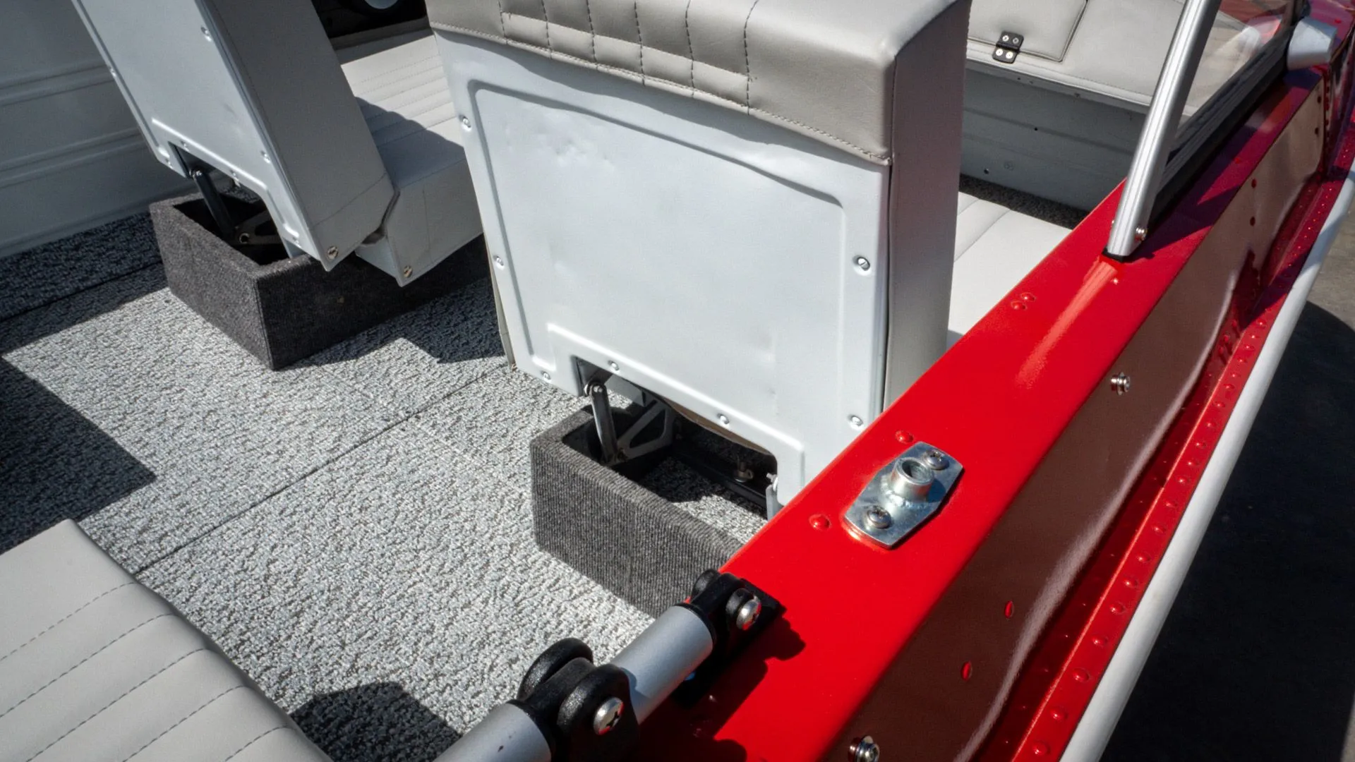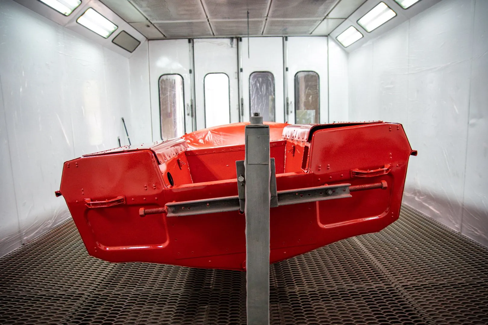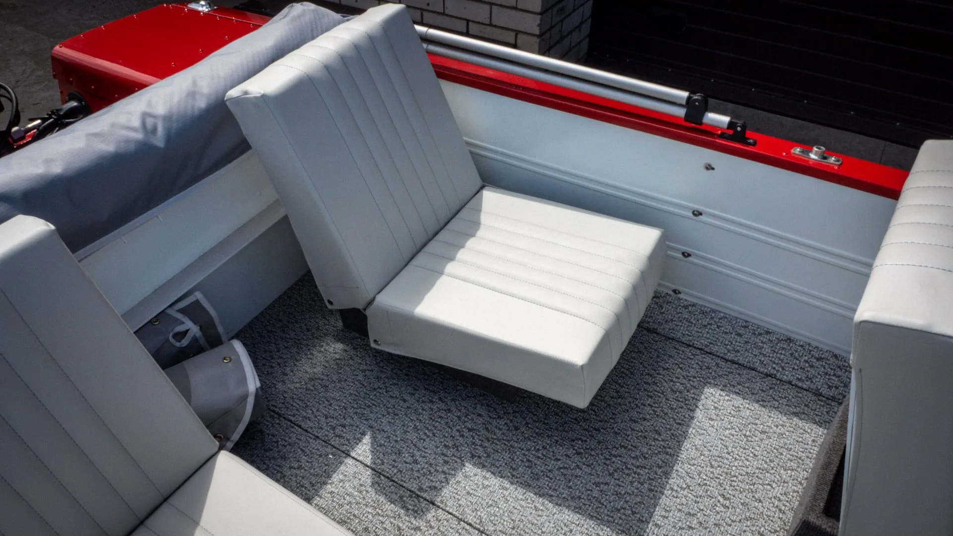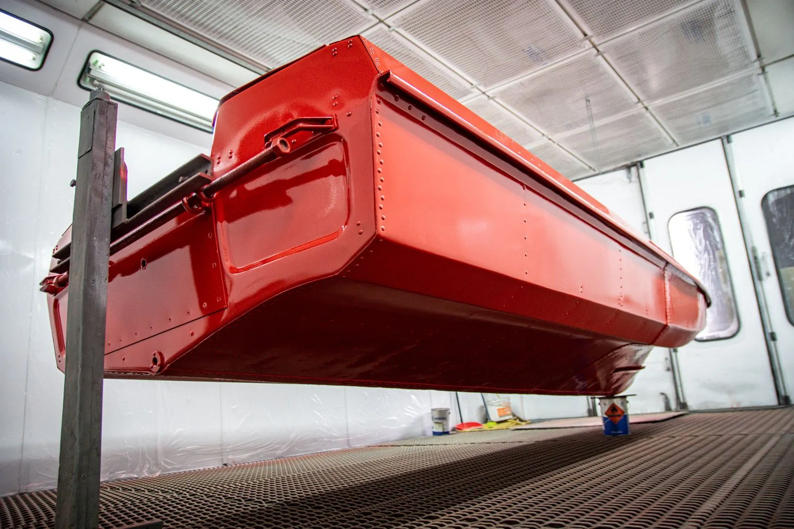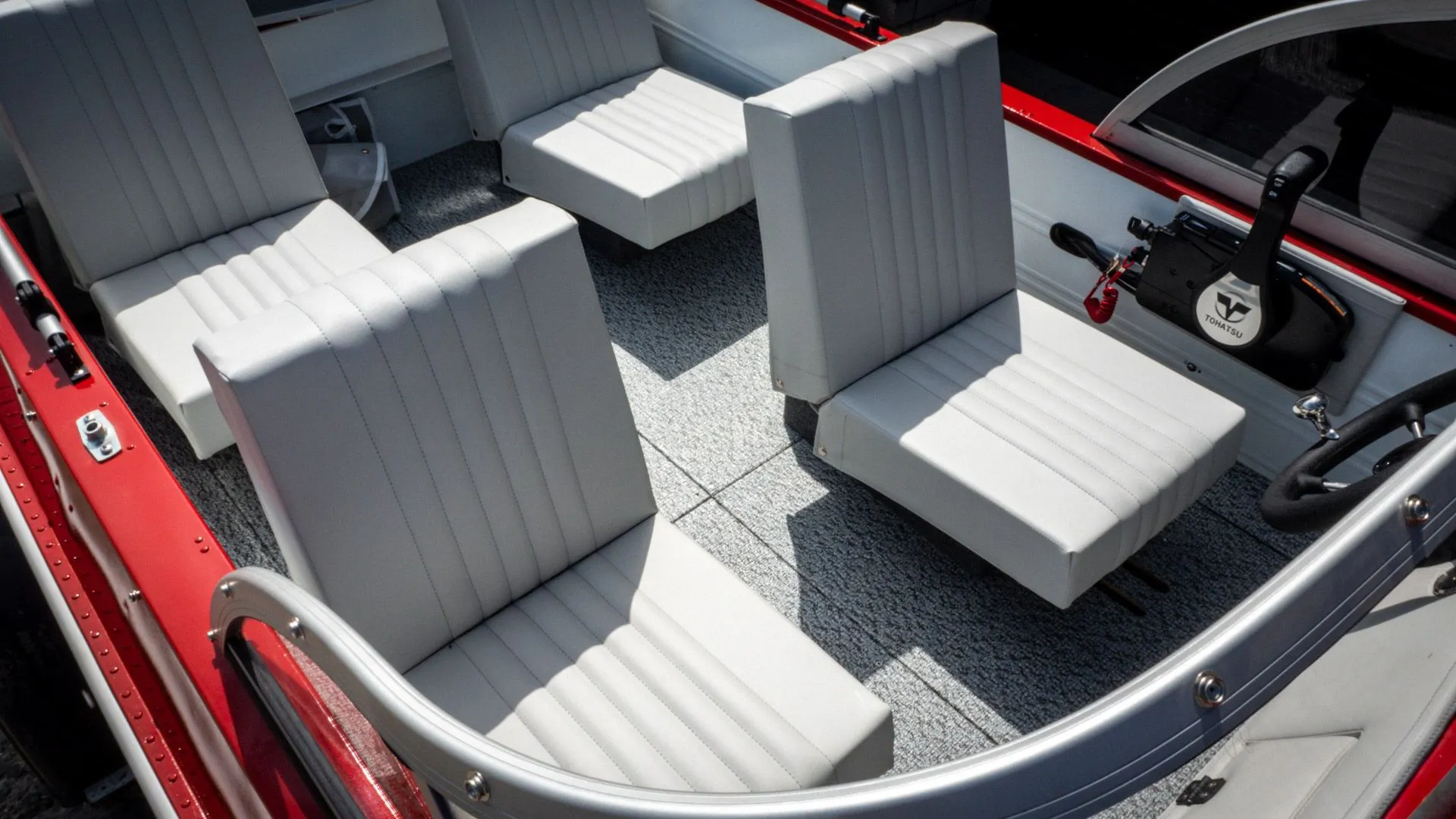 Основным цветом лодки клиент выбрал яркий красный, а бортовые зашивки кокпита и механизмы сидений было решено окрасить в белый глянец.