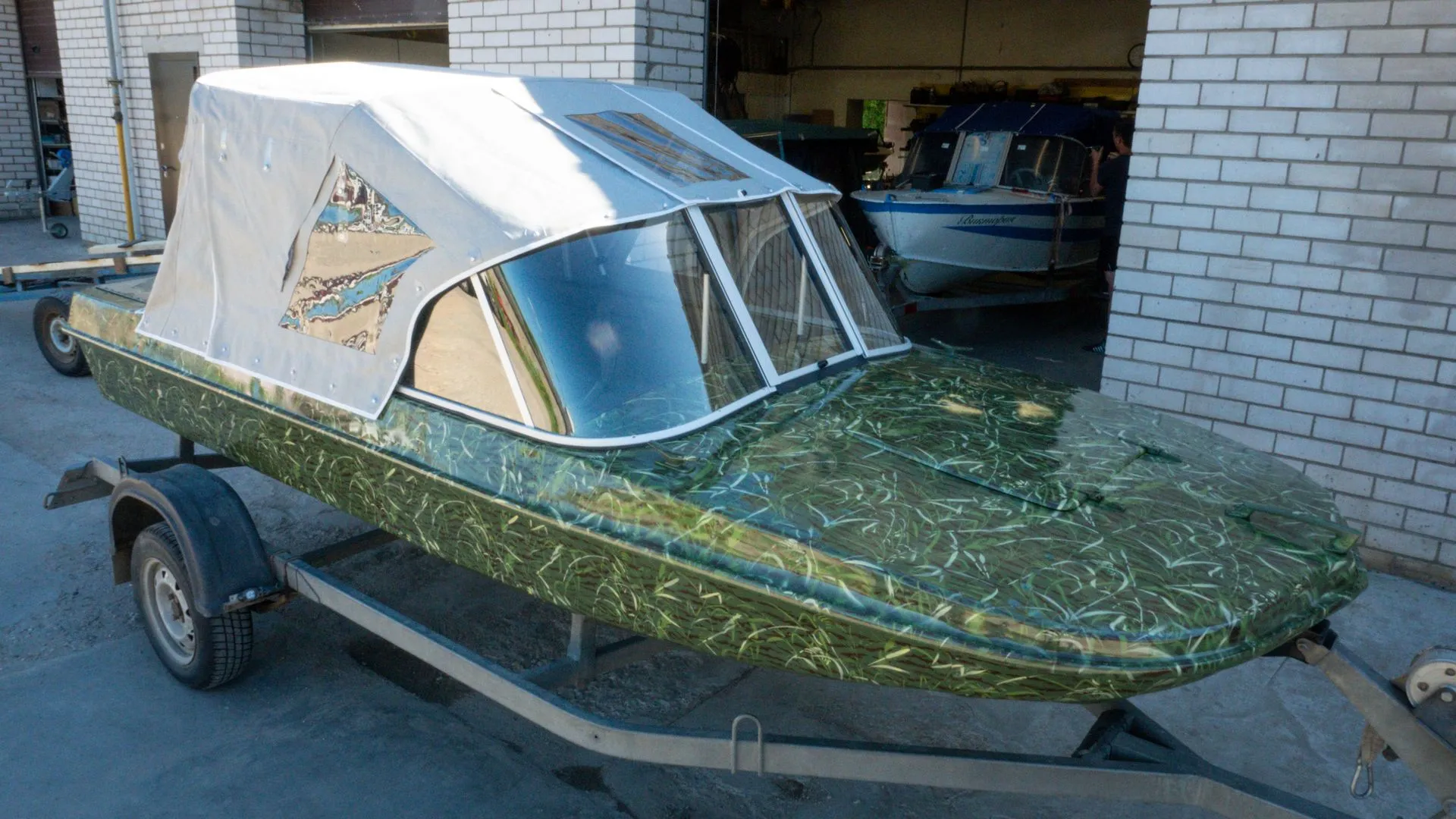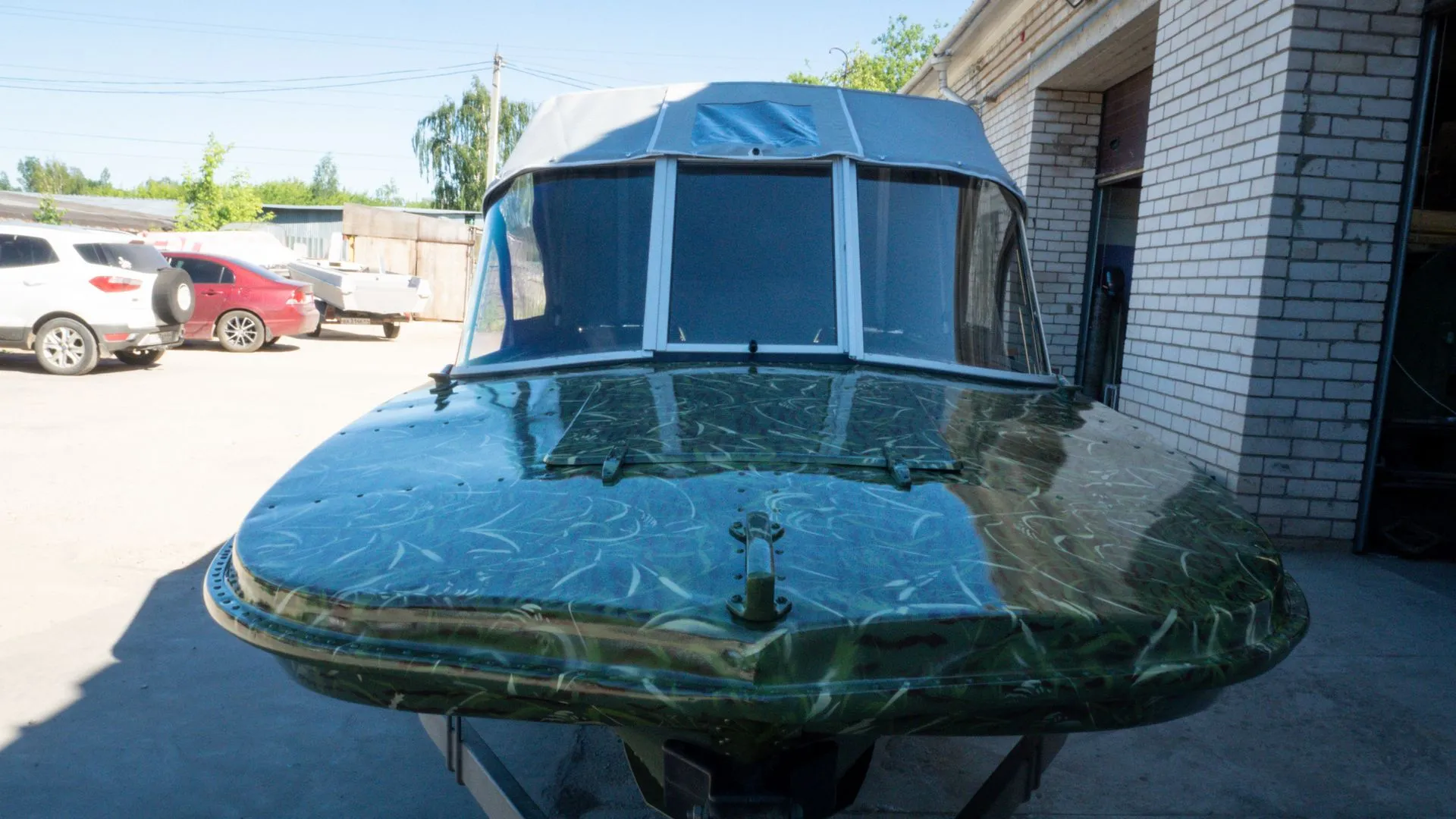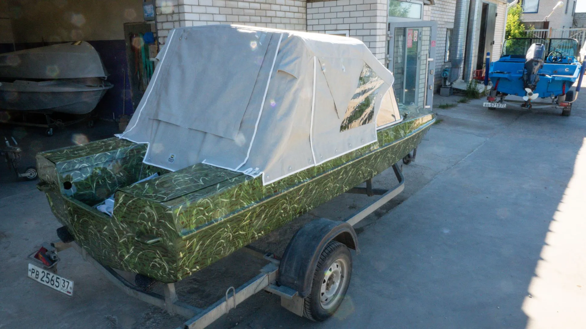 Мы подготовили корпус и переместили его в покрасочную камеру, где лодка была окрашена в один из самых популярных вариантов - камуфляж «камыш».